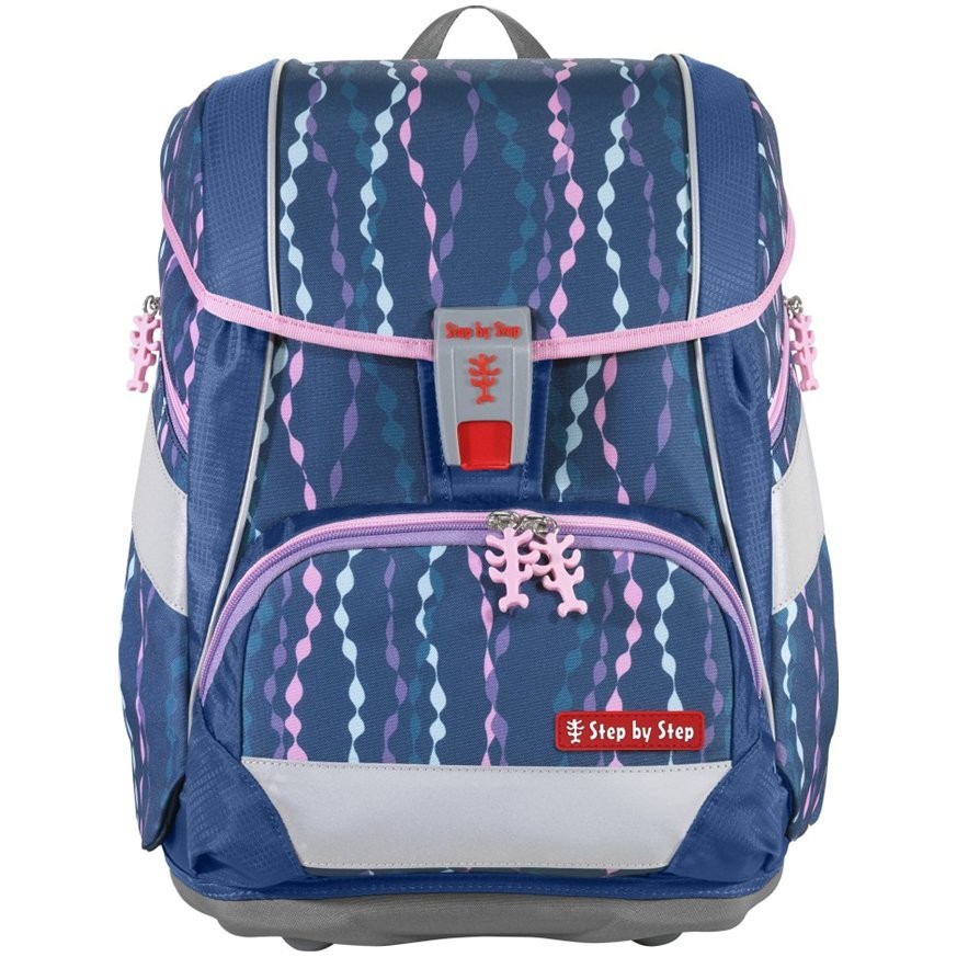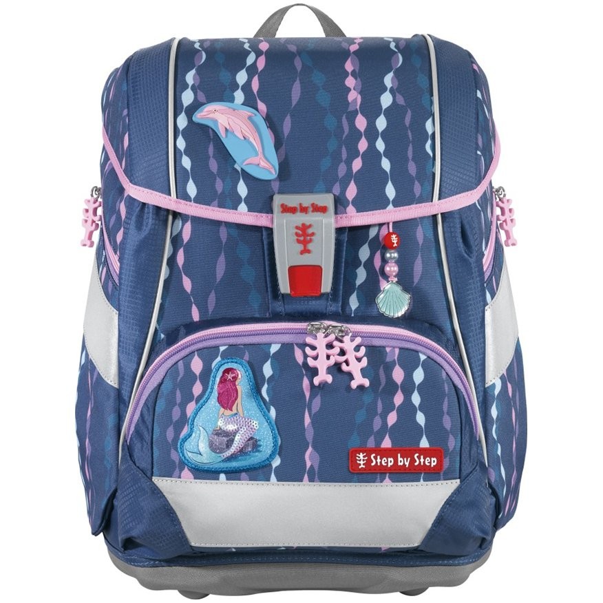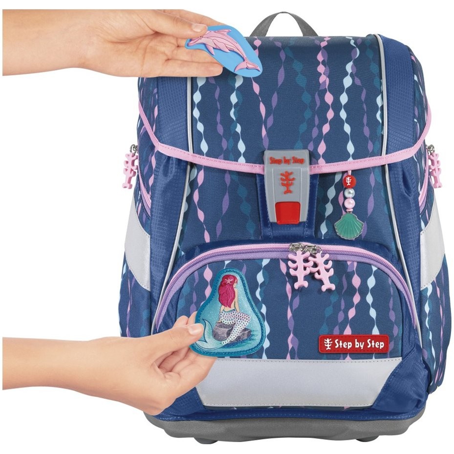 Školská aktovka Step by Step Mermaid Bella, ktorá je vhodná od 1. do 4. triedy ZŠ. 6dielny set obsahuje: aktovka do školy, vybavený peračník pre prvákov, puzdro, vrecko na cvičebný úbor alebo prezuvky, šablóny a vymeniteľné obrázky Magic Mags.