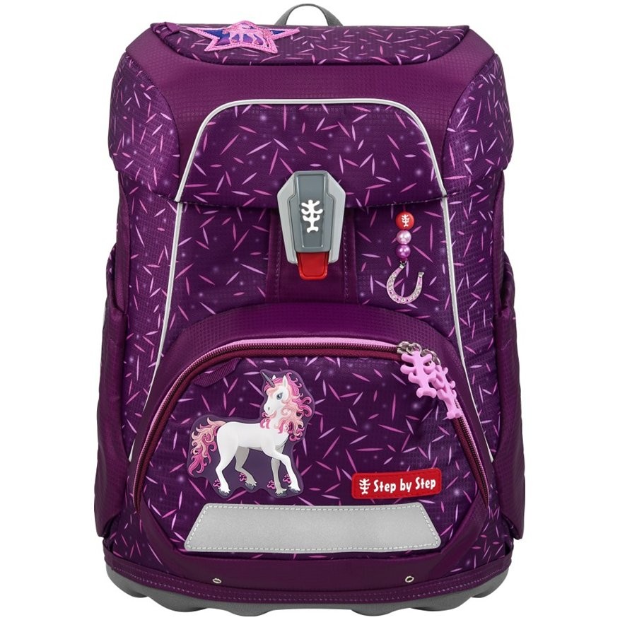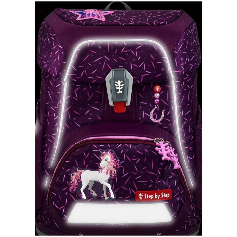 Dievčenská školská aktovka pre prváka Step by Step FIT Pretty Unicorn Nuala. Do aktovky sa zmestí všetko potrebné od pera až po športové potreby.