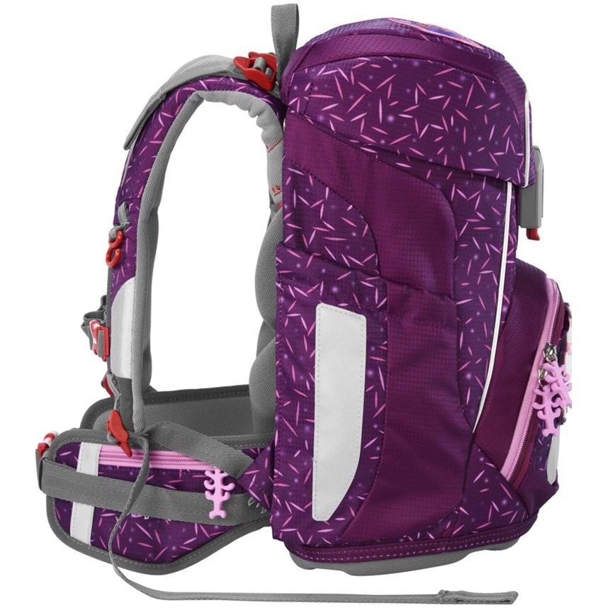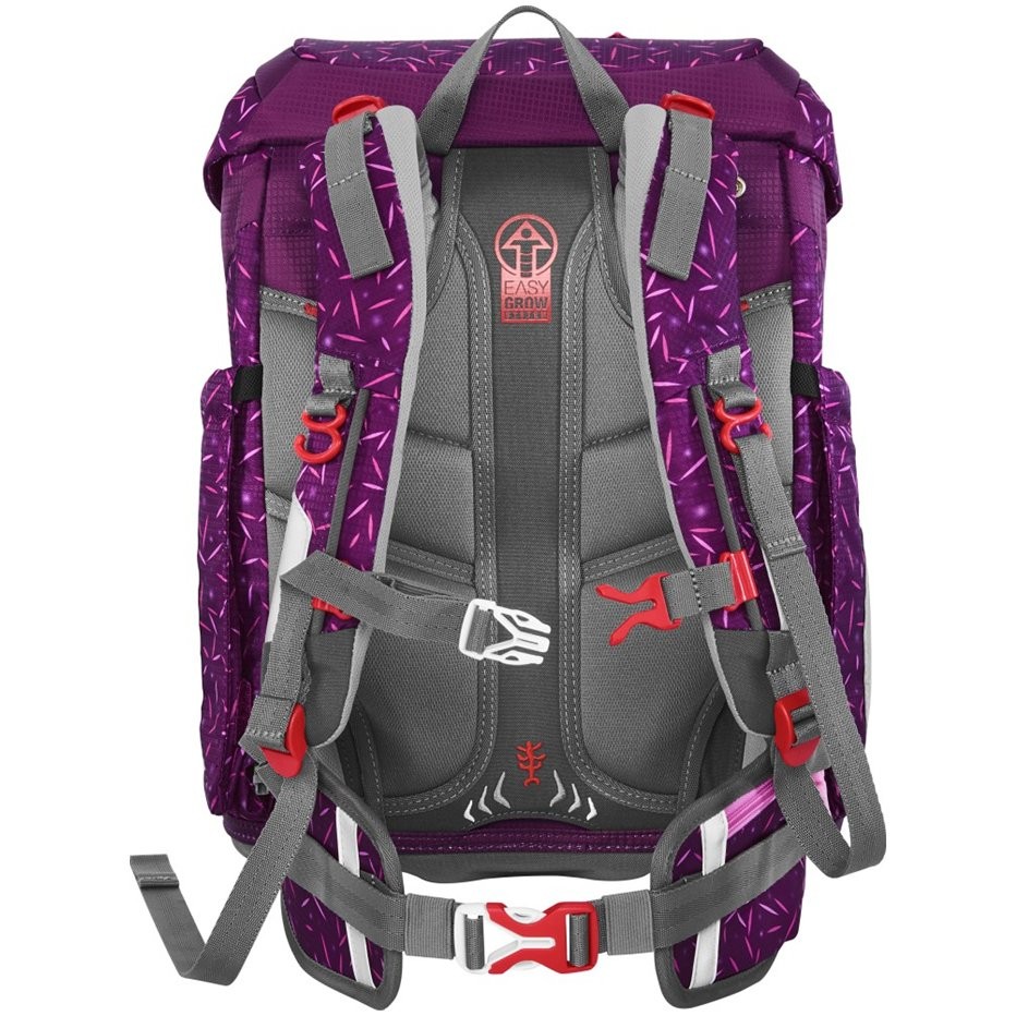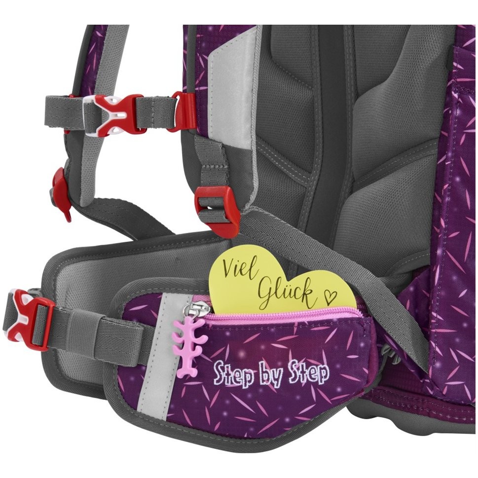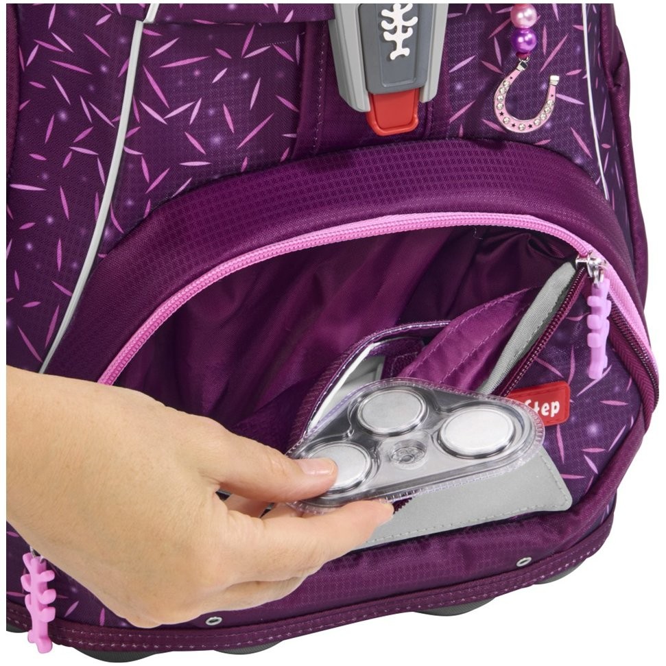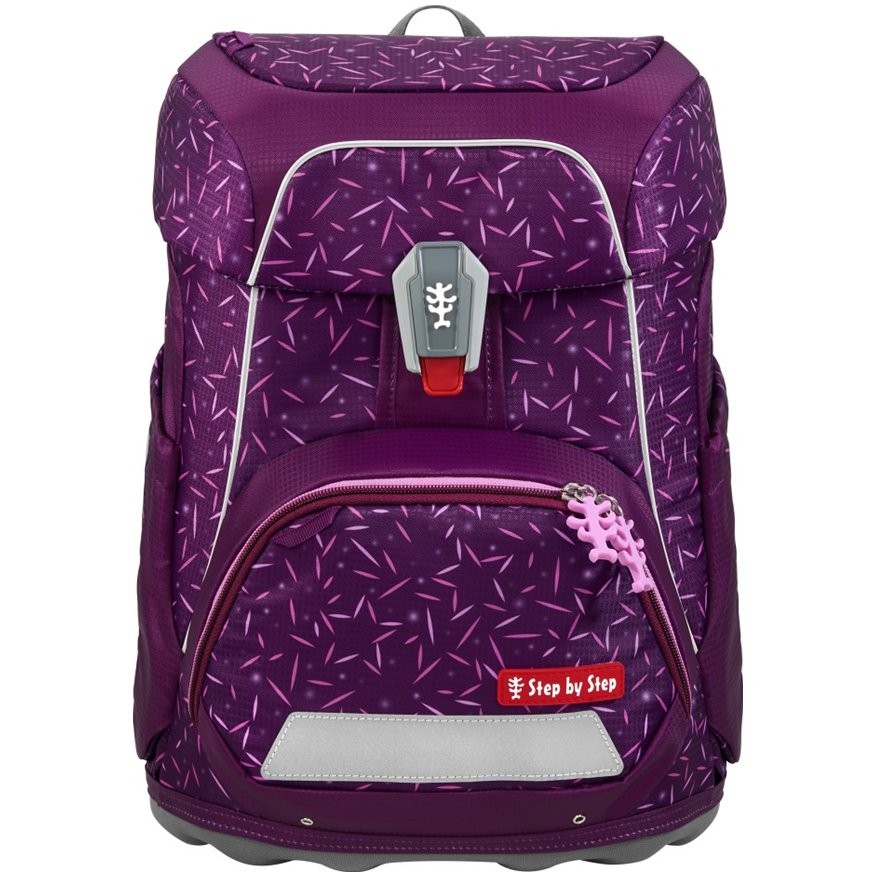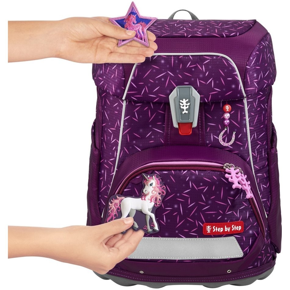 Školská taška má hmotnosť iba 990 g a je vhodná pre deti od 100 do 150 cm výšky. Aktovka má vymeniteľné obrázky MAGIC MAGS a EASY GROW SYSTEM, čo znamená, že taška rastie s dieťaťom (aktovka je vhodná pre deti od 1. do 4. triedy). Ultraľahký chrbtový panel zo sklených vlákien, ergonomicky tvarovaný chrbát s priedušným polstrovaním a nastaviteľné a ergonomické ramenné popruhy sú pri aktovke Step by Step samozrejmosťou. Aktovka disponuje tiež doťahovacími pásikmi pre tesné doliehanie aktovky k chrbtu, odnímateľným, výškovo nastaviteľným hrudným popruhom, úchytmi na koncoch ramenných popruhov a polstrovaným, odnímateľným bedrovým pásom s malým bočným vreckom na zips. Predné vrecko s termoizolačnou vrstvou a odtokovými otvormi je ideálne na uloženie desiaty. Otvorené bočné vrecká rastúce smerom von s odtokovými otvormi a pútko na nosenie/ zavesenie. Aktovka sa zatvára na magnetický uzáver FIDLOCK. Hlavné vrecko s vnútorným vreckom je vhodné pre ťažšie predmety (knižky, dosky na zošity), vďaka gumičke v klope je v aktovke viac miesta vďaka úspornému uloženiu peračníka. Vodeodolné pevné dno a skrytá priehradka na AirTag. Reflexné prvky pre väčšiu bezpečnosť v cestnej premávke, v šere av tme.