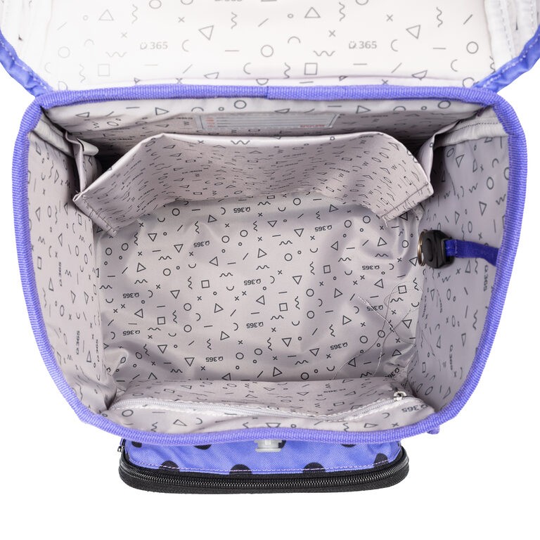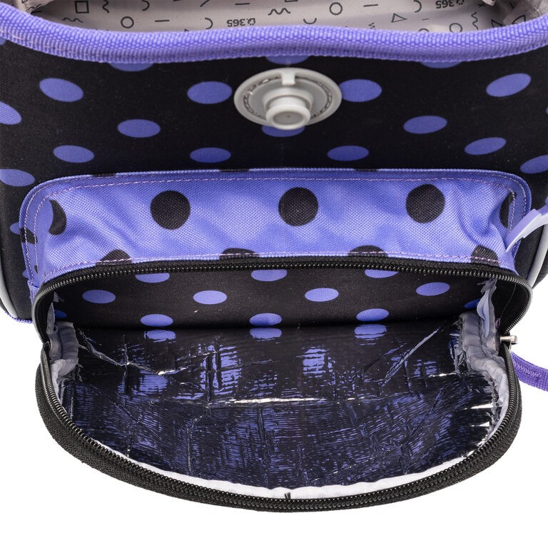 VNÚTORNÉ USPORIADANIE – priestranná hlavná vnútorná komora je rozdelená látkovou prepážkou na uloženie boxu na zošity či knihy. Súčasťou hlavnej komory je aj vrecko na drobnosti, odnímateľný krúžok na kľúče a štítok na meno a adresu. Vo veku sa nachádza priehľadné vrecko na rozvrh hodín. Vrecko na desiatový box je čiastočne termoizolačné, aby si jedlo dlhšie udržalo svoju teplotu. Po oboch stranách batohu sa nachádzajú vrecká na dáždnik alebo fľašu s nápojom. Vrecká svojím umiestnením a elastickými okrajmi pomáhajú eliminovať riziko rozliatia nápoja a poškodenia obsahu aktovky.