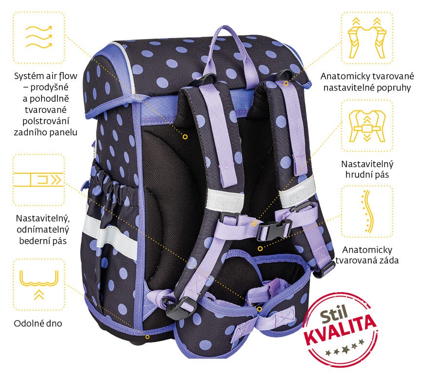 POHODLIE – výškovo nastaviteľný hrudný a novozároveň aj odnímateľný bedrový pás s kvalitnou prackou zabezpečia pohodlné usadenie aktovky na chrbte dieťaťa aj správne rozloženie hmotnosti.