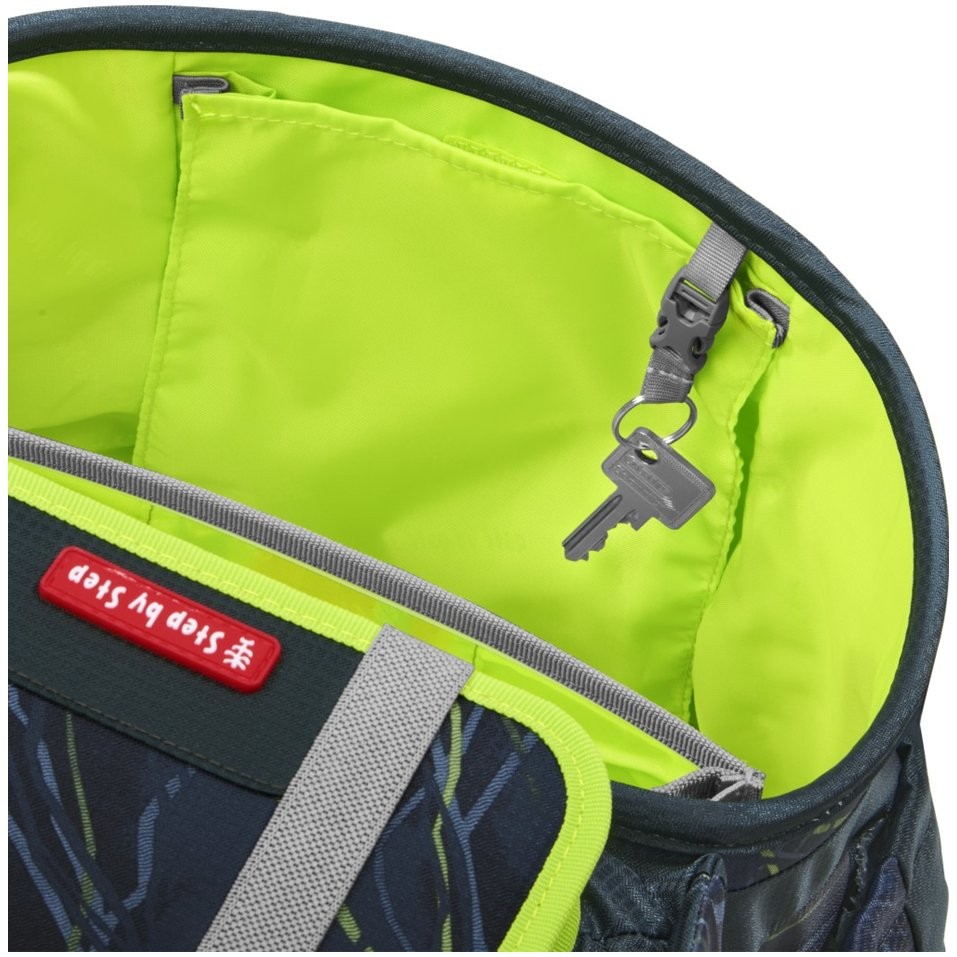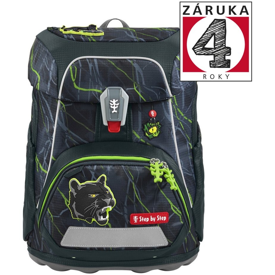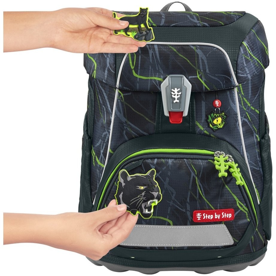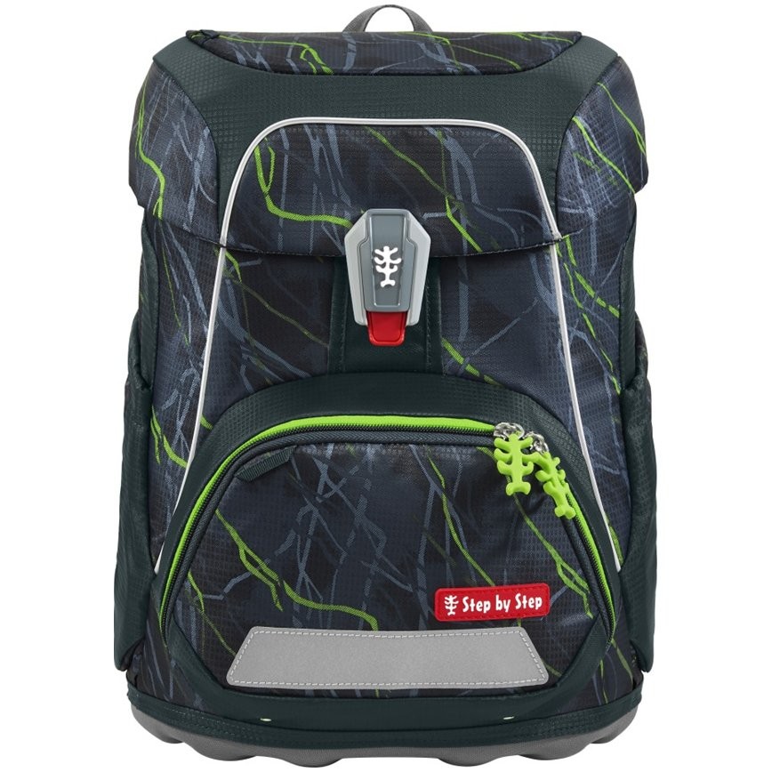 Štýlová školská aktovka má hmotnosť iba 990 g a je vhodná pre deti od 100 do 150 cm výšky. Aktovka má vymeniteľné obrázky MAGIC MAGS a EASY GROW SYSTEM, čo znamená, že taška rastie s dieťaťom (aktovka je vhodná pre deti od 1. do 4. triedy). Ultraľahký chrbtový panel zo sklených vlákien, ergonomicky tvarovaný chrbát s priedušným polstrovaním a nastaviteľné a ergonomické ramenné popruhy sú pri aktovke Step by Step samozrejmosťou. Aktovka disponuje tiež doťahovacími pásikmi pre tesné doliehanie aktovky k chrbtu, odnímateľným, výškovo nastaviteľným hrudným popruhom, úchytmi na koncoch ramenných popruhov a polstrovaným, odnímateľným bedrovým pásom s malým bočným vreckom na zips. Predné vrecko s termoizolačnou vrstvou a odtokovými otvormi je ideálne na uloženie desiaty. Otvorené bočné vrecká rastúce smerom von s odtokovými otvormi a pútko na nosenie/ zavesenie. Aktovka sa zatvára na magnetický uzáver FIDLOCK. Hlavné vrecko s vnútorným vreckom je vhodné pre ťažšie predmety (knižky, dosky na zošity), vďaka gumičke v klope je v aktovke viac miesta vďaka úspornému uloženiu peračníka. Vodeodolné pevné dno a skrytá priehradka na AirTag. Reflexné prvky pre väčšiu bezpečnosť v cestnej premávke, v šere av tme.