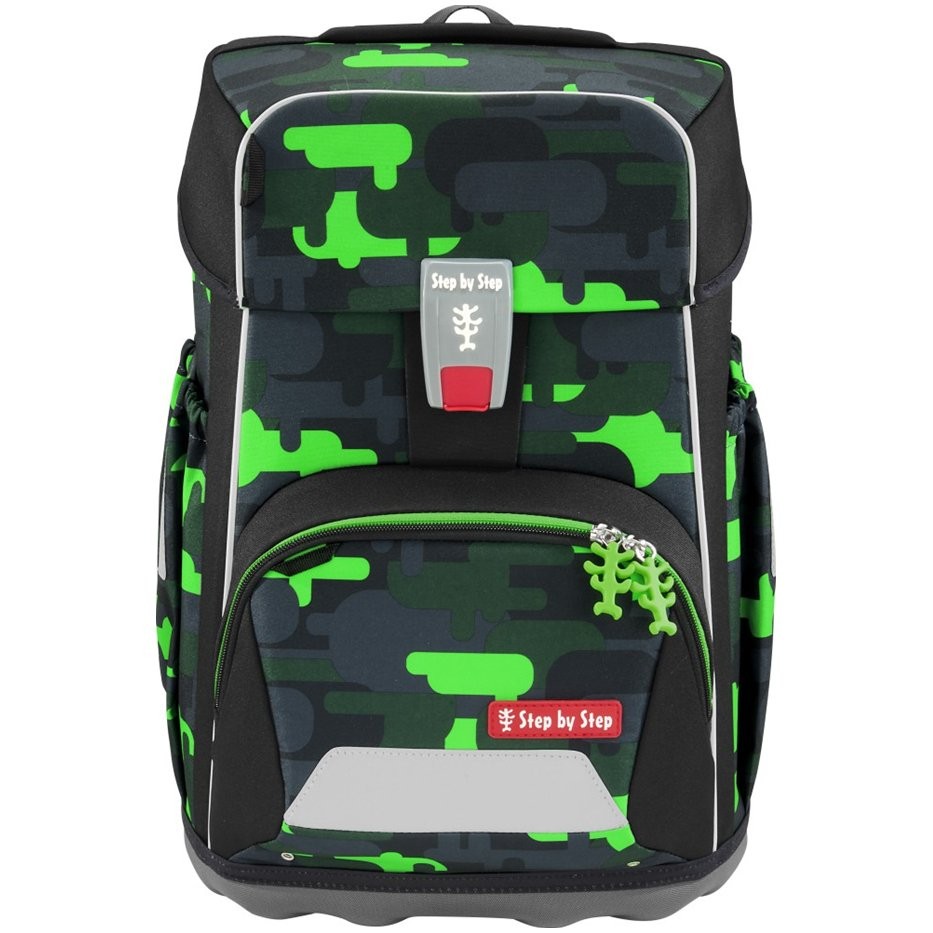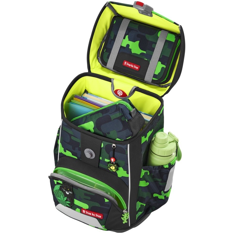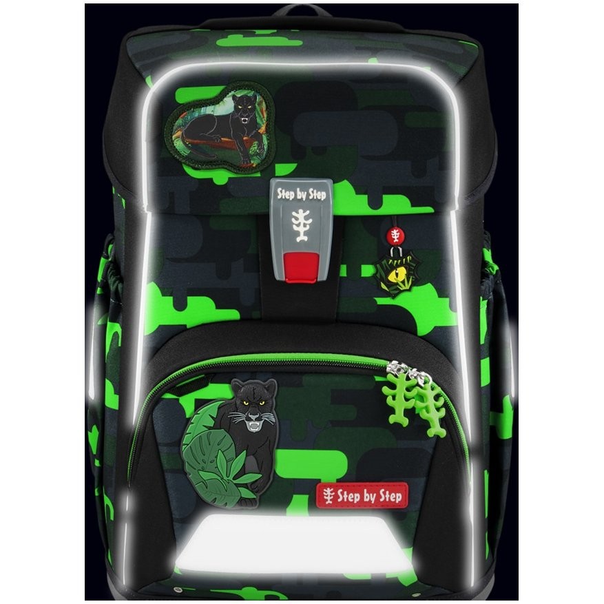 Predné vrecko s termoizolačnou vrstvou a odtokovými otvormi, otvorené bočné vrecká rastúce smerom von s odtokovými otvormi, polstrovaná rukoväť a pútko na zavesenie. Aktovka sa uzatvára na magnetický uzáver FIDLOCK. Hlavné vrecko s vnútorným vreckom sú vhodné pre ťažšie predmety (knižky, dosky na zošity) a gumičky v klope na úsporné uloženie peračníka. Taška do školy má vodeodolné pevné dno, reflexné prvky pre väčšiu bezpečnosť v cestnej premávke a je vyrobená z odolného a vodoodpudivého materiálu. Použitá impregnácia je bez PFC a textílie sú vyrobené zo 100% recyklovaných PET fliaš.