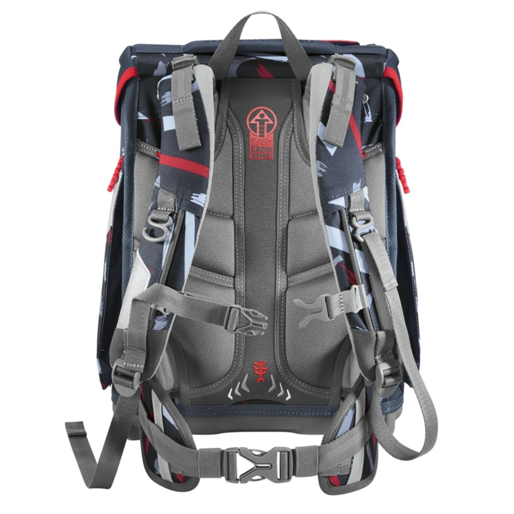 Školská taška vybavená ultraľahkým chrbtovým panelom zo sklených vlákien, ergonomicky tvarovaným chrbtom s priedušným polstrovaním a nastaviteľnými ramennými popruhmi. Súčasťou je aj výškovo nastaviteľný hrudný popruh a odnímateľný polstrovaný bedrový pás, ktoré pomáhajú rovnomerne rozložiť hmotnosť.