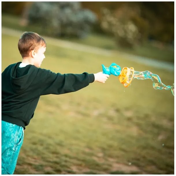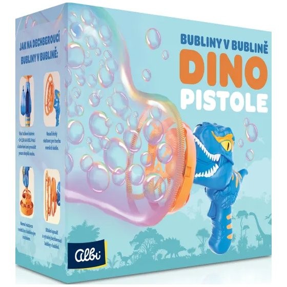 Detská pištoľ má roztomilý dizajn dinosaura, doplňovací zásobník a je šetrná k životnému prostrediu. Elektrická pištoľ funguje na tužkové batérie (3×AA), má automatický vetrák a iba jedno tlačidlo pre jednoduchú obsluhu, ktorú zvládnu deti už od 3 rokov. Batérie nie sú súčasťou balenia. Sada Bublifuk - Dino pištoľ obsahuje: dinosaurie pištoľ, 2 nástavce, bublinovú zmes, kalíšok na zmes.