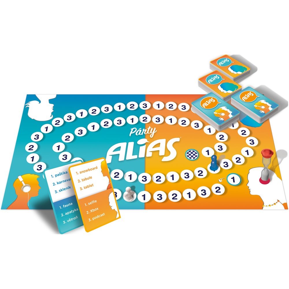 Hra Párty Alias Súboj generácií obsahuje: herný plán, 400 kariet obsahujúcich 2 400 slov, presýpacie hodiny, 2 figúrky a pravidlá.