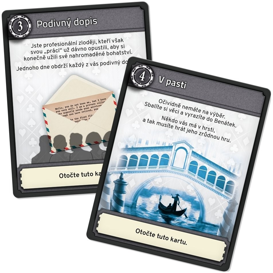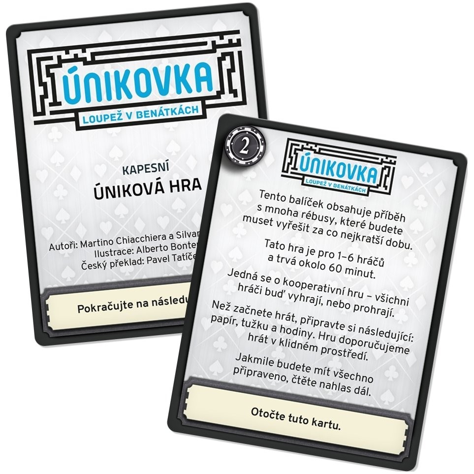 Dokážete sa vlámať do slávneho kasína v Benátkach a ukradnúť žetón obrovskej hodnoty? Únikovka je kartovou variáciou na populárne únikové hry, pri ktorých sa skupina priateľov (alebo kolegov) nechá zamknúť do miestnosti plnej rébusov a snaží sa z nej v časovom limite uniknúť preč.