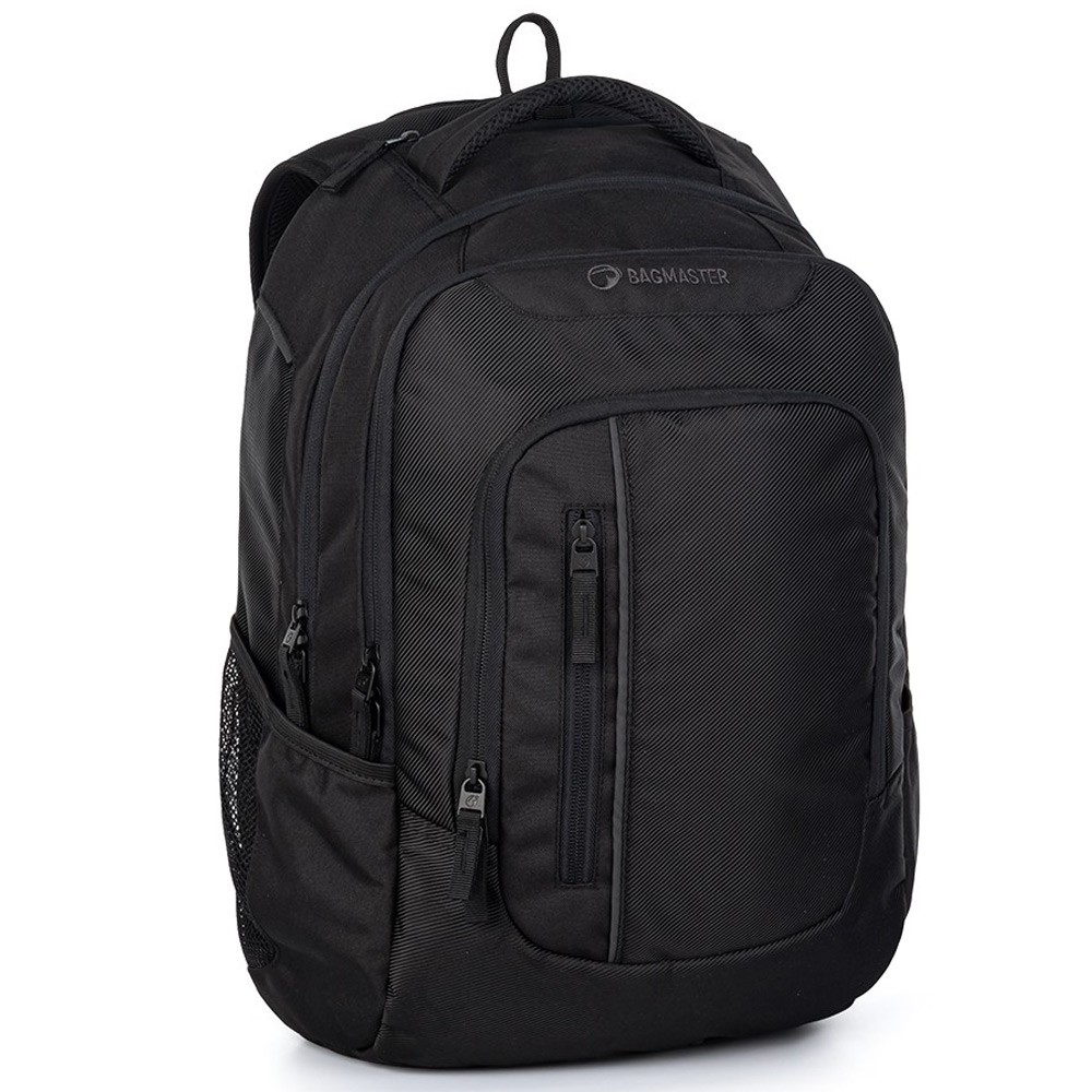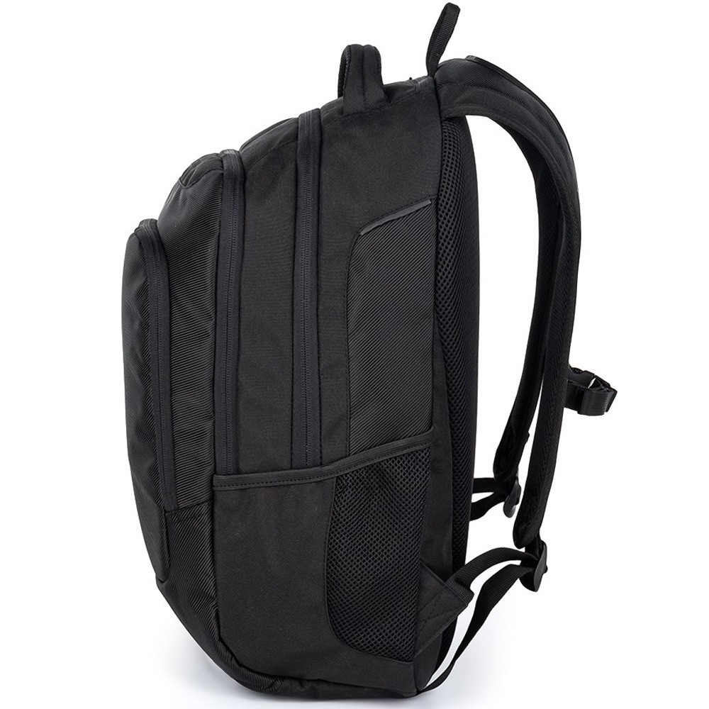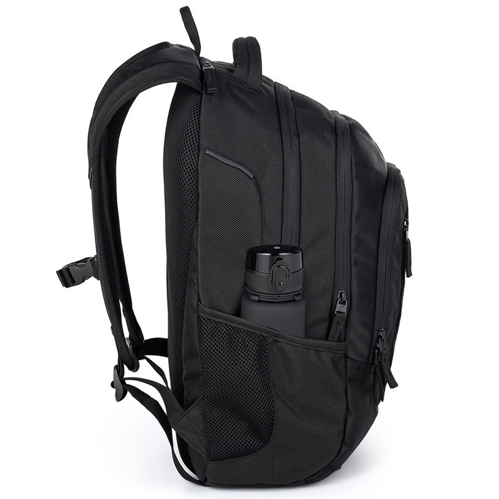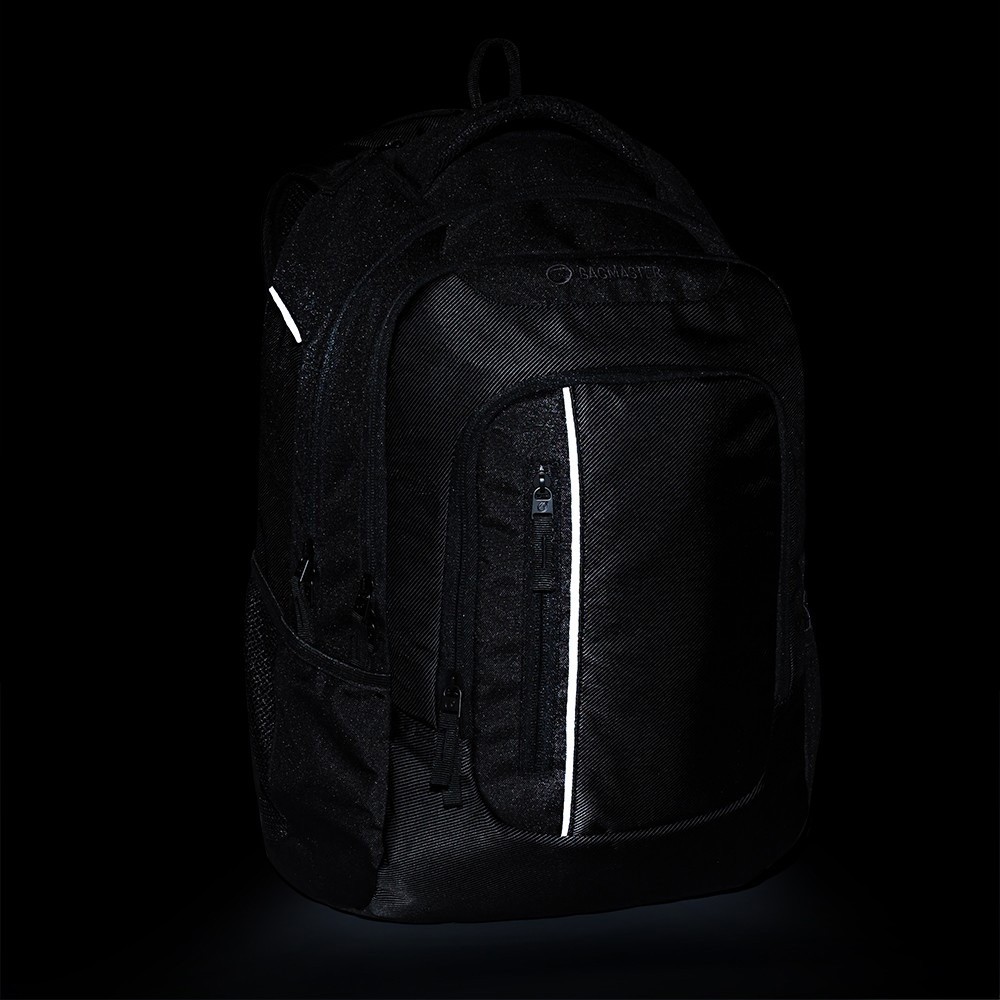 Čierny batoh dvojkomorový s polstrovaným vreckom na notebook, organizérom, mäkkým vreckom na okuliare a ďalšími menšími vreckami. Využiteľný do mesta, do školy, do práce aj na šport.