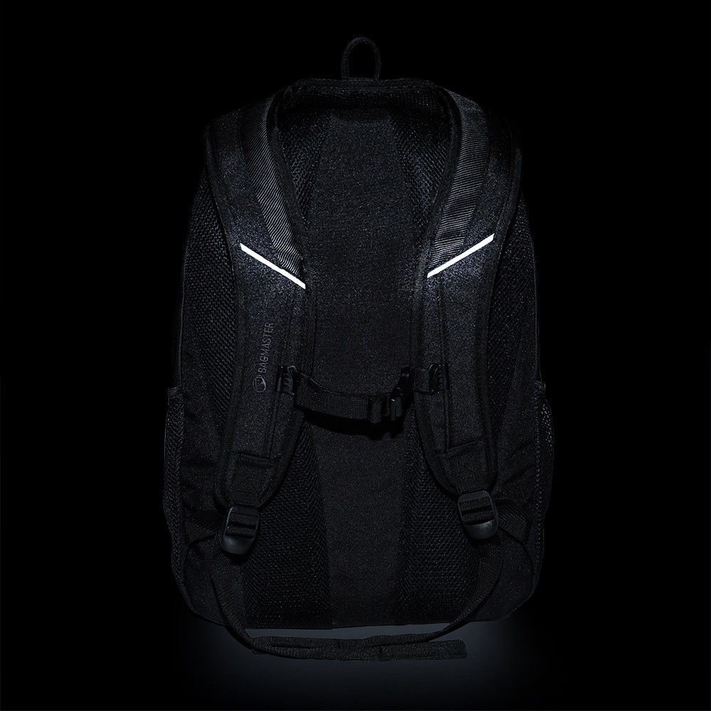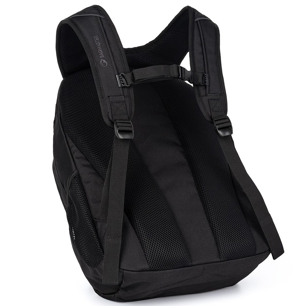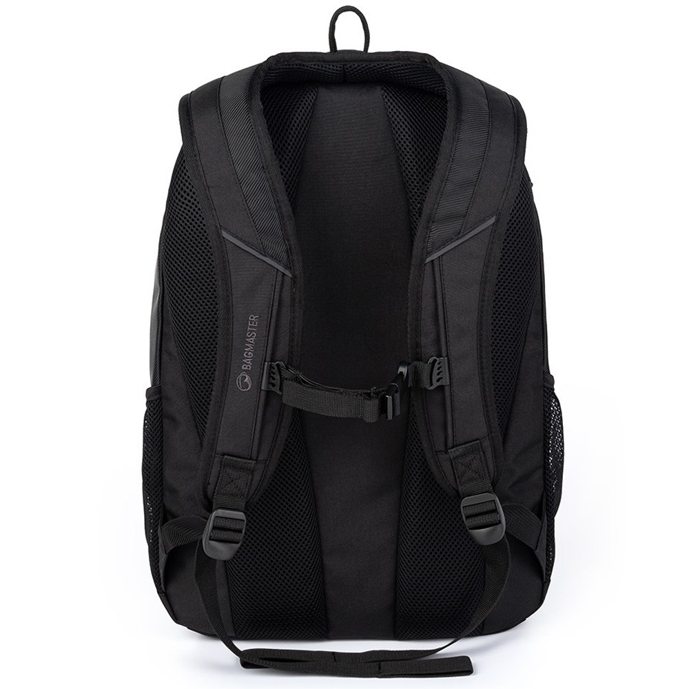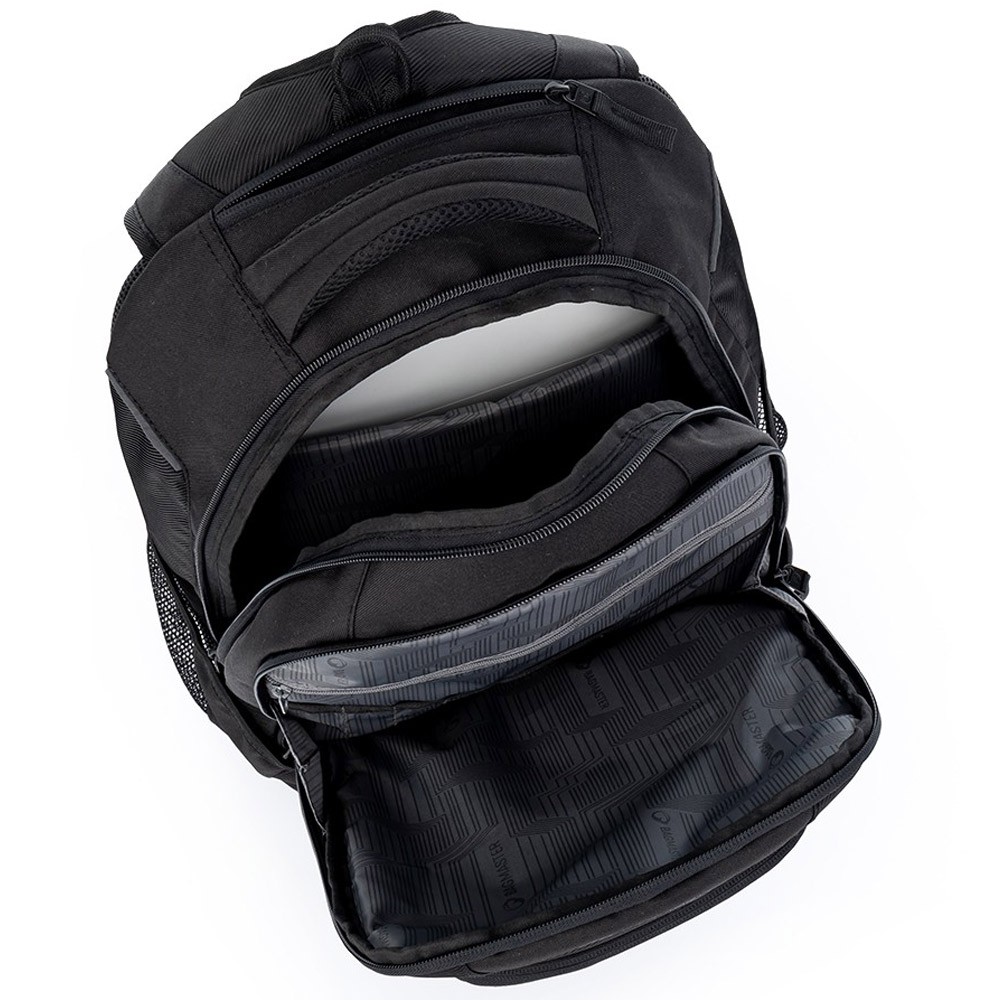 Čierny batoh dvojkomorový s polstrovaným vreckom na notebook, organizérom, mäkkým vreckom na okuliare a ďalšími menšími vreckami. Využiteľný do mesta, do školy, do práce aj na šport.