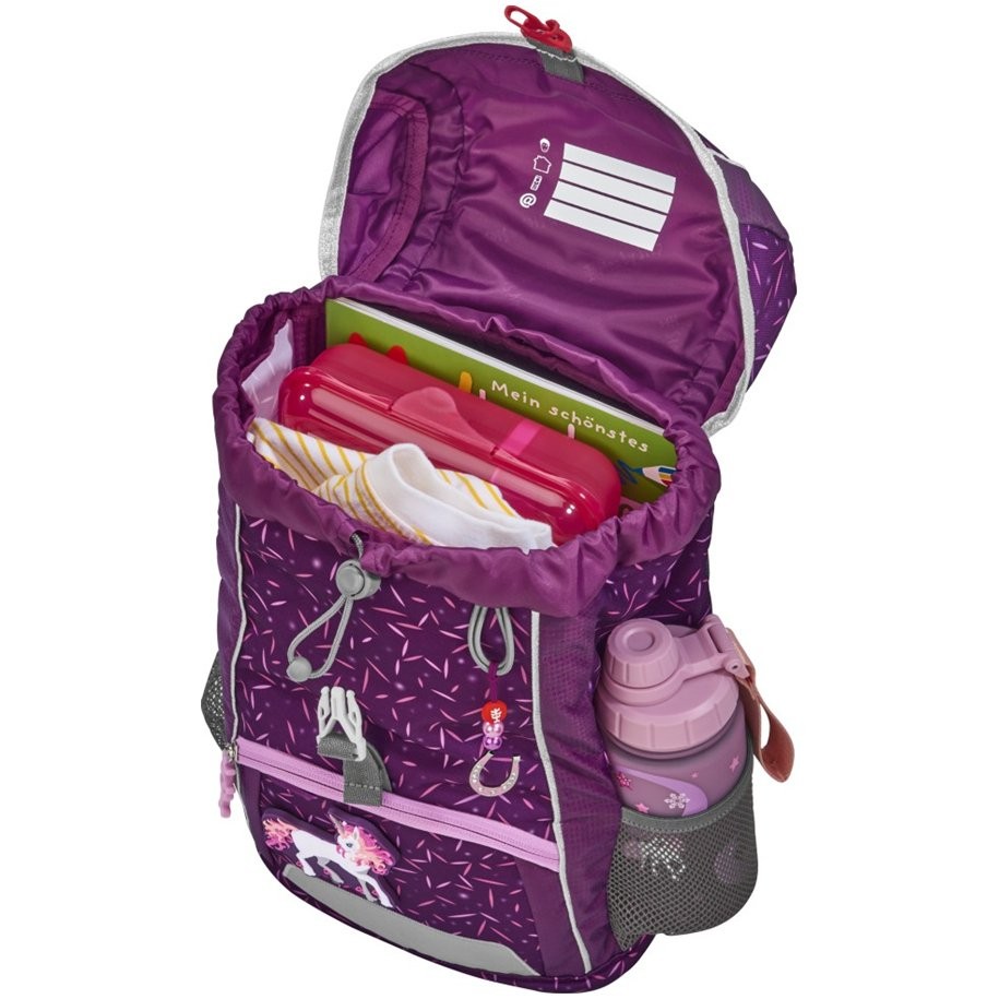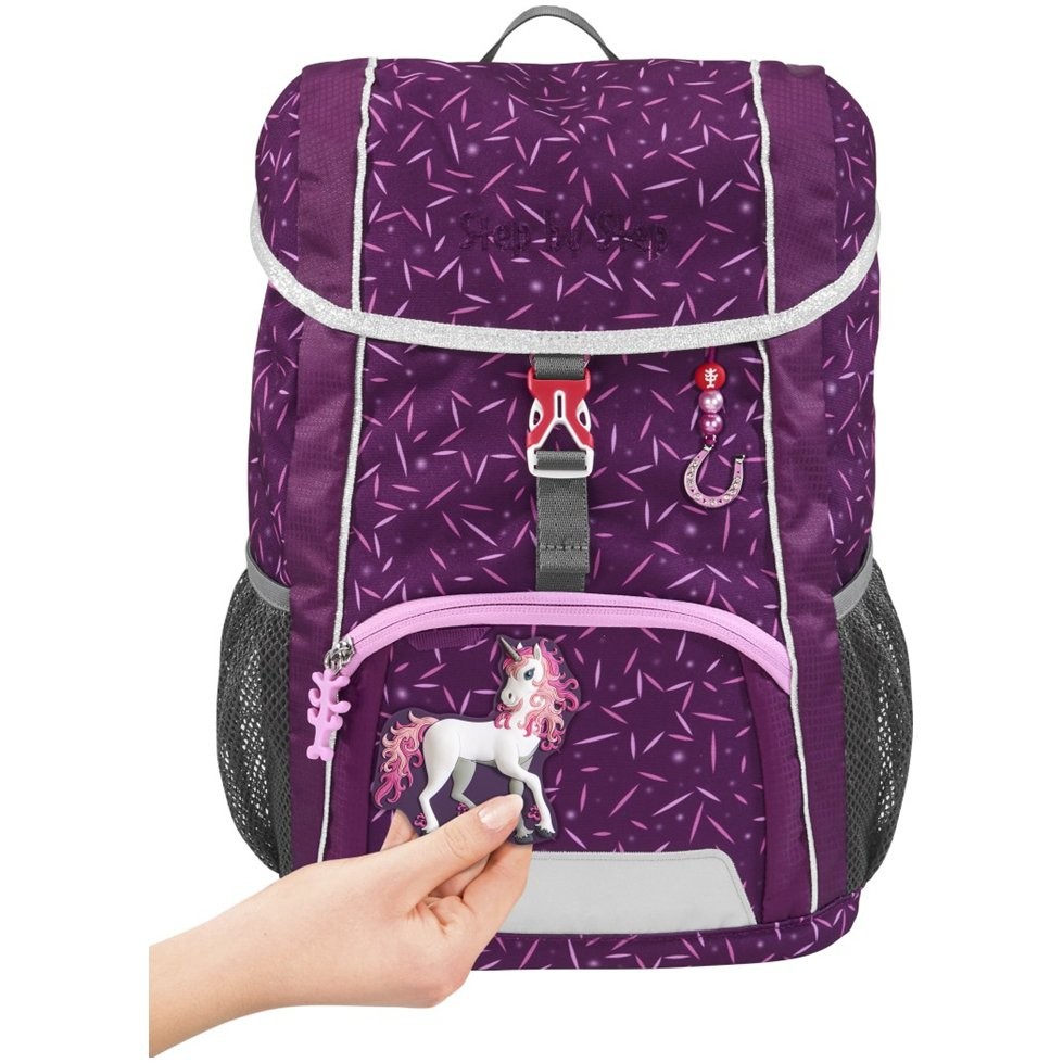 Priestranný detský batoh pre dievčatá, hmotnosť 380 g, optimálny pre deti do škôlky, ale aj ako voľnočasový batoh pre deti od 1. do 4. triedy má vymeniteľné obrázky MAGIC MAGS, ergonomicky tvarovaný chrbát a ergonomicky tvarovaný chrbát. Reflexnými prvkami a výškovo nastaviteľný hrudný popruh sú samozdrejmosťou. Batoh má aj pútko na nosenie / zavesenie av klope batohu je vrecko uzatvárateľné na zips. Na batohu sú dve otvorené bočné vrecká a predné vrecko na zips s reflexnými prvkami. Jednoduchá pracka na uzavretie, priestranné hlavné vrecko so sťahovadlom, vrecko A4 s elastickým pásikom a krúžok na zavesenie príveskov, kľúčov apod. V batohu je menovka. Batoh pre deti má umývateľné dno batohu a vodoodpudivý materiál. Je teda ideálna aj na výlety.