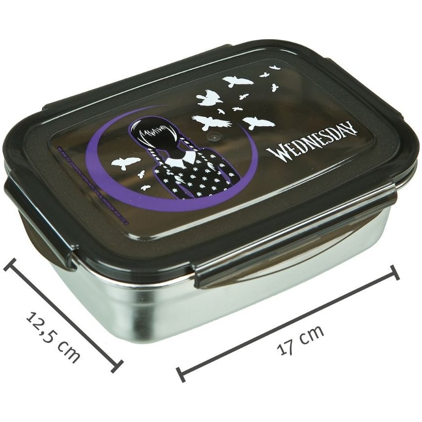 Desiatový box s motívom Wednesday v praktickom prevedení z nerezovej ocele as priehľadným vekom. Objem 550 ml poskytuje dostatok miesta na obed alebo desiatu do školy aj na výlety. Kompaktné rozmery a odolný materiál z neho robia spoľahlivého parťáka na každý deň – s nádychom temného štýlu Wednesday.