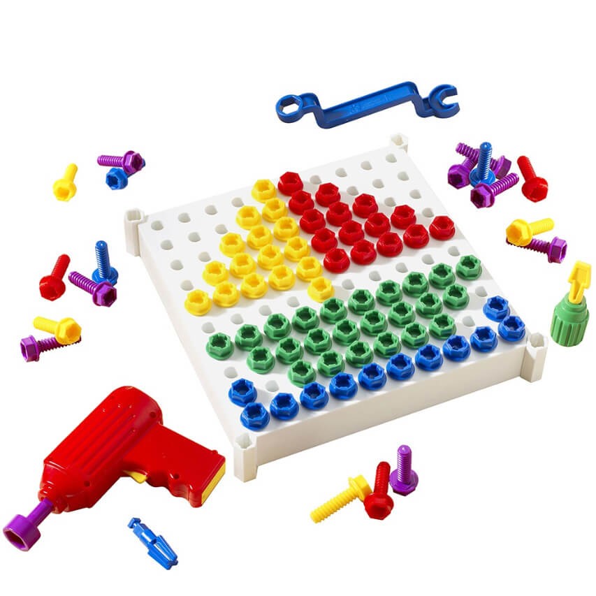 Kreatívna skrutkovacia mozaika pre deti od 3 rokov s naozajstným elektrickým skrutkovačom a tromi rôznymi nadstavcami. Pri hraní si deti rozvíjajú svoju fantáziu a zlepšujú svoju koordináciu spolu s kreatívnym myslením. Deti pracujú podľa farebných kartičiek s postupmi pre vytvorenie rôznych obrazcov a vzorov. Môžu tiež zoskrutkovať svoje vlastné obrázky.