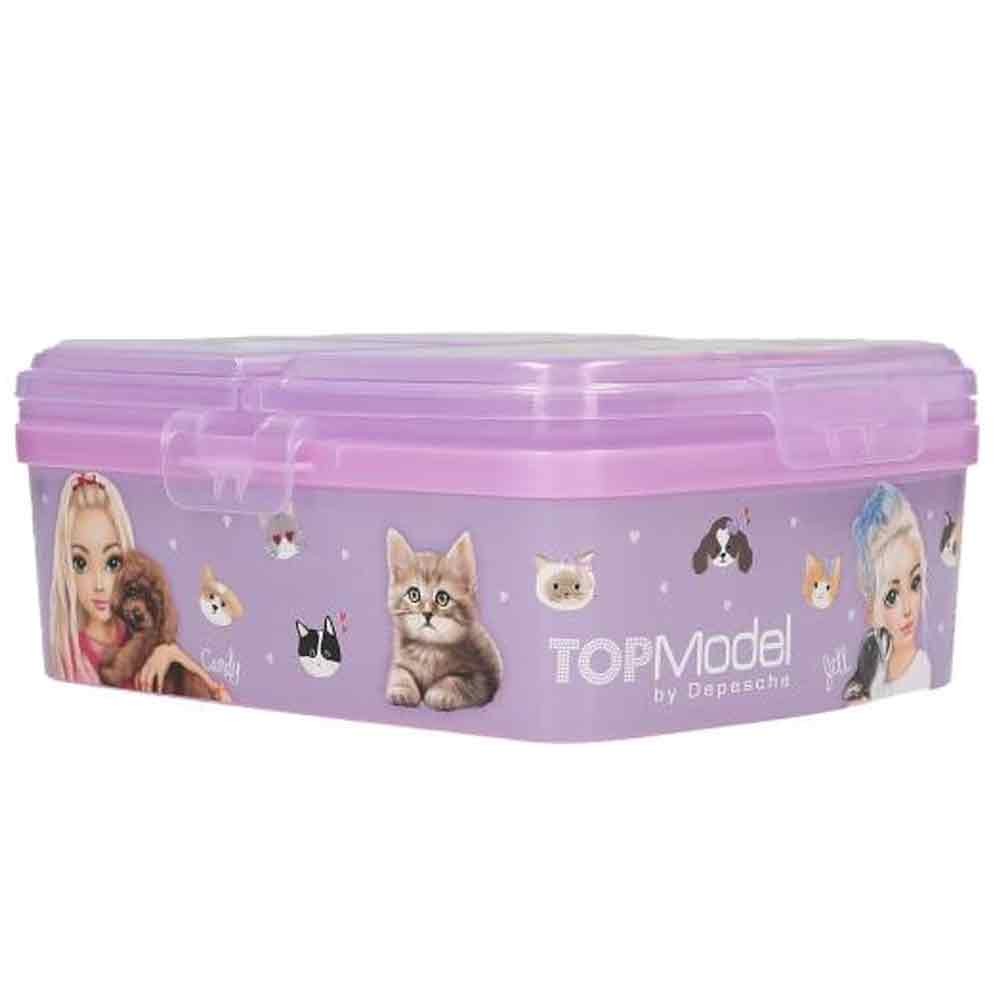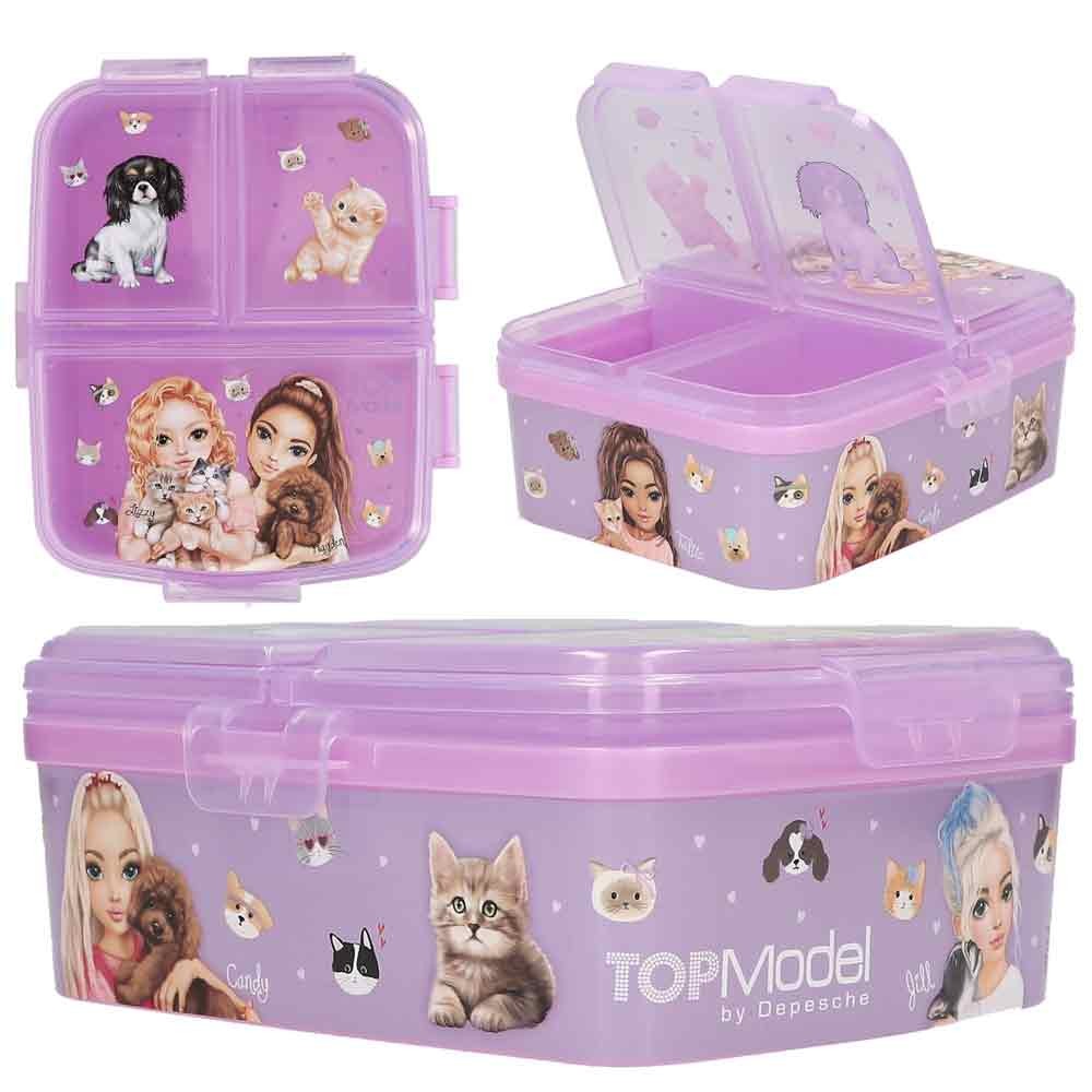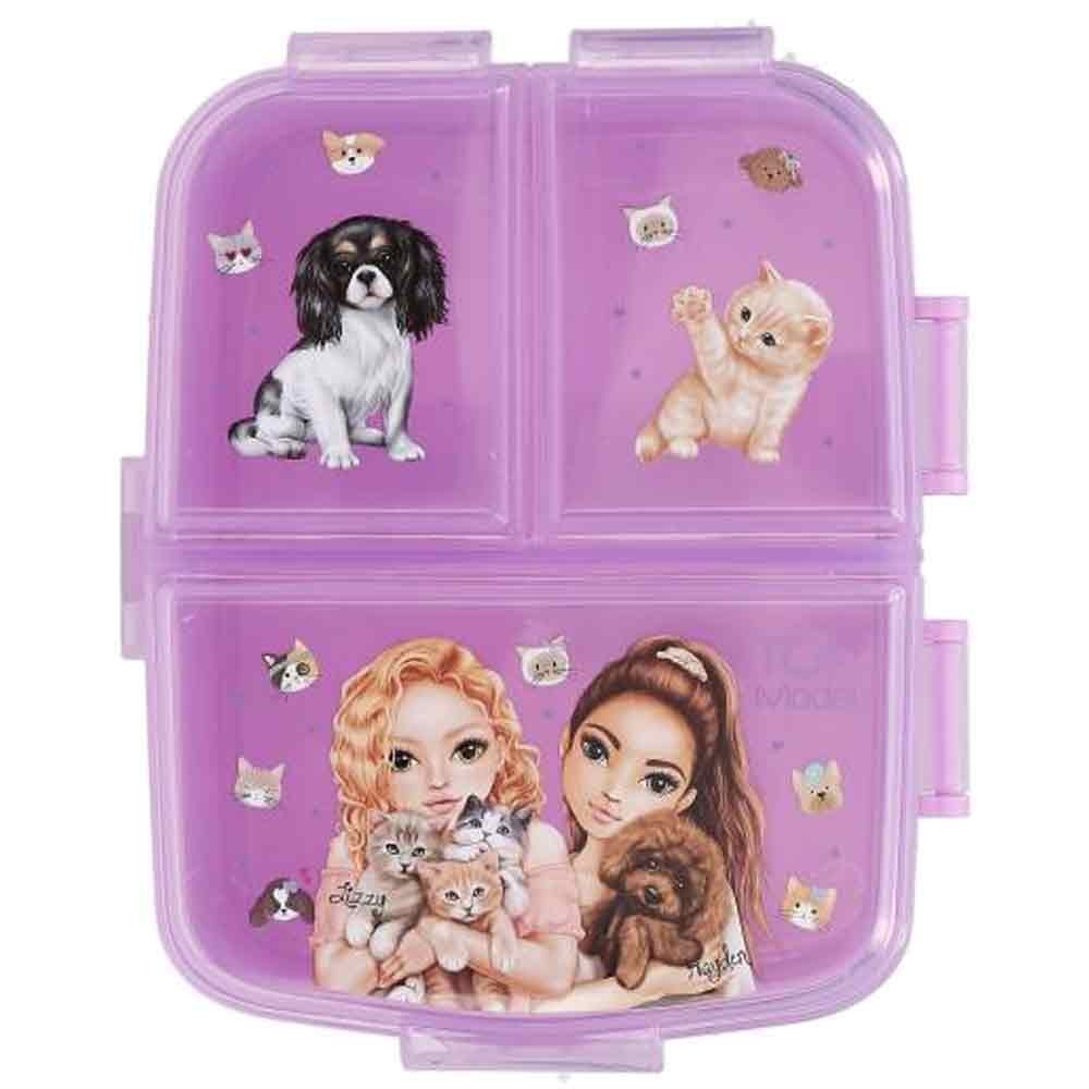 Roztomilá detská krabička na desiatu od značky Top Model v jemne fialovej farbe poteší všetkých milovníkov zvieratiek. Box je ozdobený ilustráciami modeliek a množstvom mačiek a psov, čo z neho robí štýlový doplnok do školy aj na cesty. Tento desiatovy box má horné poschodie s tromi oddelenými priehradkami a veľký spodný priestor – ideálny na ovocie, pečivo aj drobné pochúťky. Krabička sa ľahko zmestí do batohu a vďaka pevnému zatváraniu udrží všetko na svojom mieste. Nevhodné do umývačky a mikrovlnky.