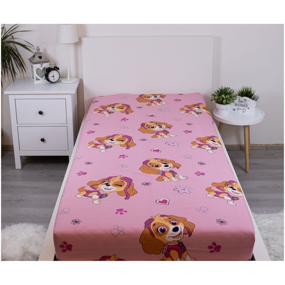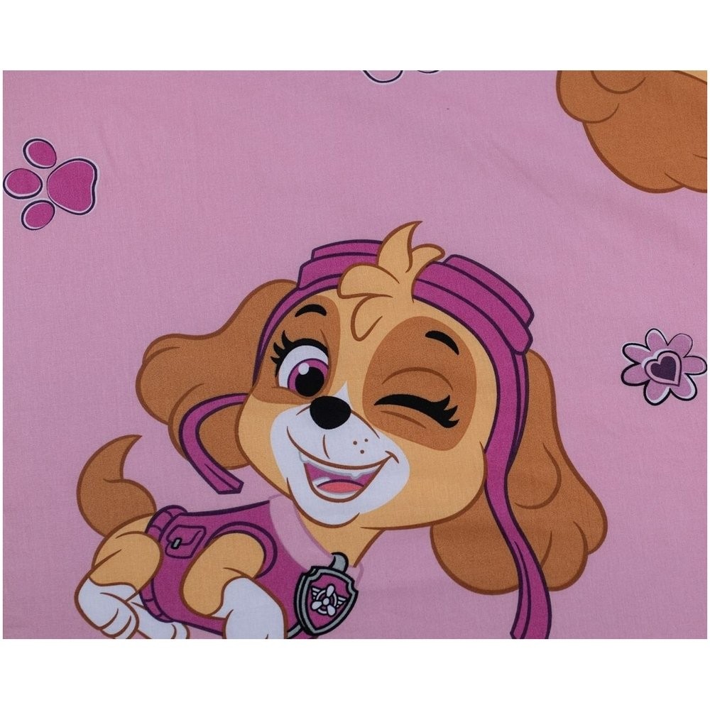 Roztomilá detská plachta 90x200 s motívom obľúbenej psej hrdinky Skye z animovaného seriálu Tlapková patrola. Ružový podklad zdobí opakujúce sa obrázky Skye v rôznych pozíciách, doplnené o kvetinky, srdiečka a labky. Ideálne pre malé fanúšičky tejto odvážnej pilotky.