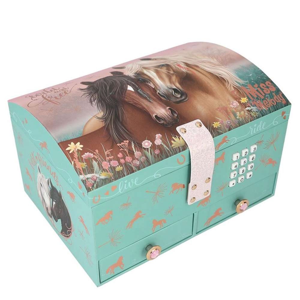 Štýlová šperkovnica od Miss Melody s motívom roztomilých koníkov na lúke poteší každú milovníčku šperkov a módnych doplnkov. Šperkovnica pre dievčatá je vybavená elektronickým zámkom na kód, vďaka ktorému zostanú všetky poklady v bezpečí. Pri otvorení sa navyše ozve zvukový efekt, ktorý dodá ešte viac zábavy. Vnútri nájdete praktické priehradky na prstienky, náušnice aj náramky a veľké zrkadlo na vnútornej strane veka. Spodná časť obsahuje dve zásuvky s originálnymi úchytkami. Šperkovnica je nielen praktická, ale aj úžasný doplnok do izbičky!