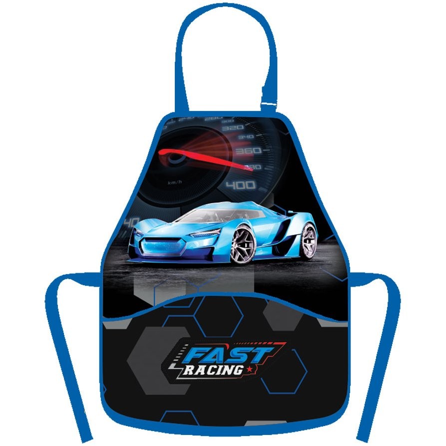 Zástera s motívom auta do výtvarnej výchovy či na iné tvoriace aktivity. Zapínanie na sponku okolo krku (dĺžka max. 50 cm), v páse šnúrky na zaviazanie (max. 80 cm). Vpredu dve priestranné vrecká.