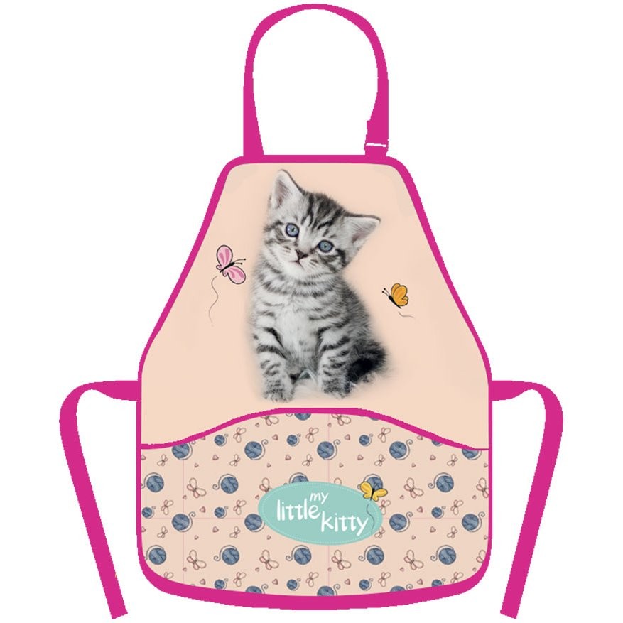 Zástera s motívom mačky do výtvarnej výchovy či na iné tvoriace aktivity. Zapínanie na sponku okolo krku (dĺžka max. 50 cm), v páse šnúrky na zaviazanie (max. 80 cm). Vpredu dve priestranné vrecká.