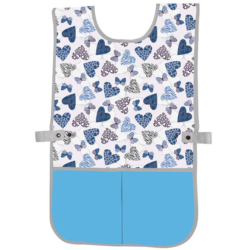 Praktický strih zástery na výtvarnú výchovu, ktorá je zapínateľná na cvoky. Nie je potrebné zaväzovať zásteru na chrbte, cvokmi je jednoducho nastaviteľná veľkosť okolo pásu a zároveň je vďaka novému strihu chránená väčšia časť tela.
