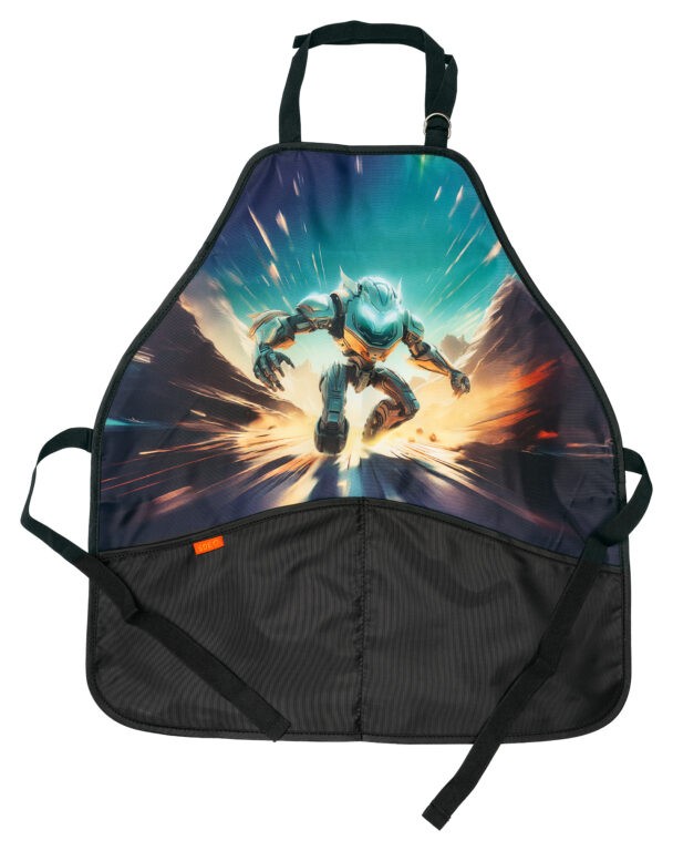 Zásterka na výtvarnú výchovu Stil Sci-fi sa navlieka nastaviteľným popruhom cez hlavu a zaviaže sa okolo tela pomocou šnúrok. Je vyrobená z umývateľného polyesterového materiálu, ktorý sa ľahko udržuje. Na prednej strane sú 2 vrecká na výtvarné pomôcky. Hlavná časť zásterky je potlačená obrázkami v školských dizajnoch, ladiacich k školskej kolekcii.