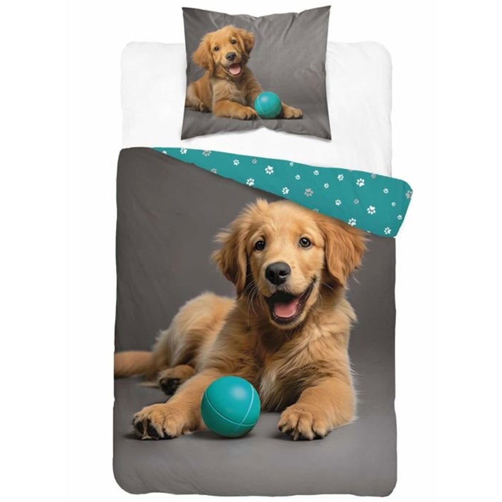 Obojstranné bavlnené detské obliečky pes s loptičkou. Obliečky na veľkú posteľ, obsahuje jednu obliečku na prikrývku a obliečku na vankúš, zapínanie je na zips.