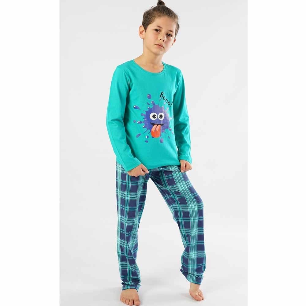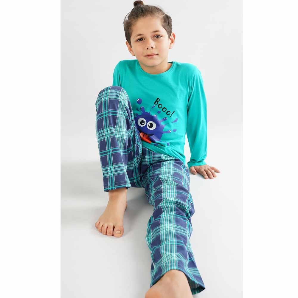 Detské pyžamo dlhé Matěj sa skladá z trička s dlhým rukávom a dlhých nohavíc. Na tričku je obrázok strašiaka s nápisom Boo. Výrazné tričko dopĺňajú kockované nohavice. Použitý materiál je jemný a poddajný na dotyk. Pyžamo je vhodné aj na denné nosenie.