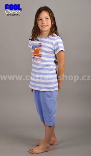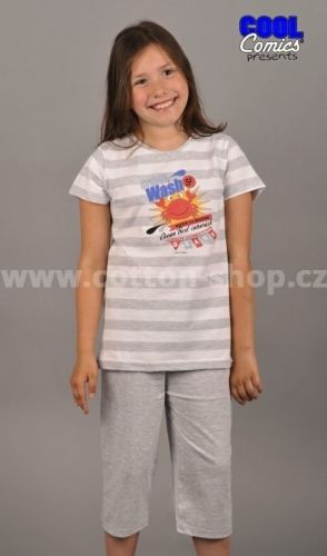 Detské bavlnené kapri pyžamo Krab. Pyžamo tvorí pruhované tričko s krátkym rukávom a kapri nohavice. Tričko zdobí potlač kraba s nápisom Crabby Wash. Jednofarebné kapri nohavice majú v páse gumu. Bavlnený materiál je poddajný a jemný na dotyk. Pyžamo je vhodné i na denné nosenie.