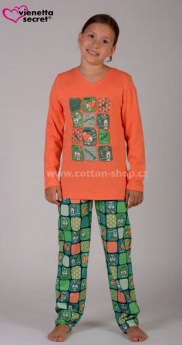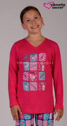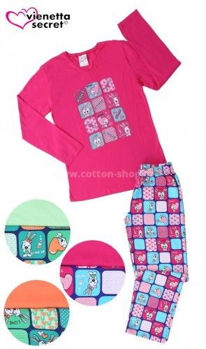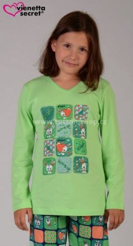 Detské dlhé bavlnené pyžamo Králici. Pyžamo tvorí tričko z dlhým rukávom a dlhé nohavice. Tričko zdobí potlač veselých králikov. Dlhé nohavice majú v páse gumu a sú potlačené králikmi. Bavlnený materiál je poddajný a jemný na dotyk. Pyžamo je vhodné i na denné nosenie.