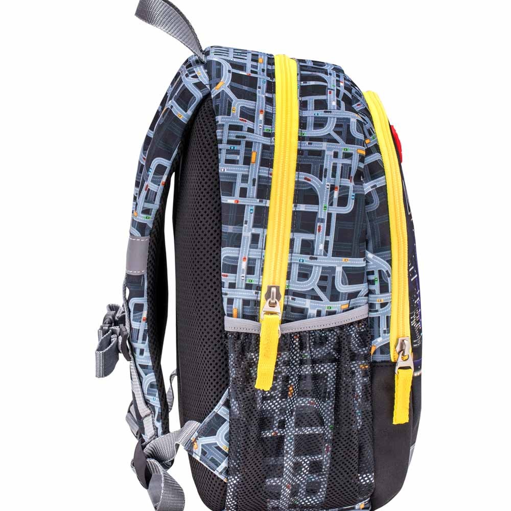 Chrbát batôžku je polstrovaný mäkkou sieťovanou penou, ramenné popruhy sú širšie, tiež polstrované a ľahko nastaviteľné. Hrudný popruh poslúži k optimálnemu rozloženiu záťaže a zabraňuje skĺznutiu batohu z detských ramien. Batoh má 2 komory - väčšia komora má na podšívke tlačenú menovku. Bočné sieťované vrecká pojmú fľašu na pitie (až 0,7 l) alebo dáždnik.