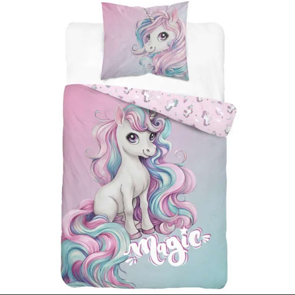Roztomilé bavlnené detské obliečky s motívom jednorožca prinesú do detskej izby jemnú pastelovú mágiu. Veselý dizajn s veľkými žiarivými očami a dúhovou hrivou očarí každého malého rojka. Hebká 100% bavlna je príjemná na dotyk, priedušná a šetrná k citlivej pokožke, takže zaistí pokojný a pohodlný spánok. Praktické zapínanie na zips uľahčí prezliekanie a pevné švy zaručia dlhú životnosť.