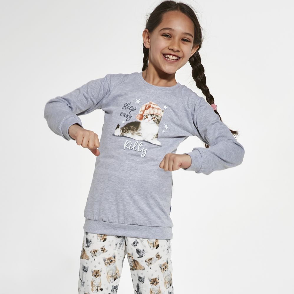 Pohodlné dievčenské pyžamo z kvalitnej, veľmi pekné a mäkkej bavlny. Tričko s dlhým rukávom, vpredu zdobené potlačou s mačiatkom. Dlhé vzorované nohavice. Výstrih, manžety, spodná časť košele a nohy sú zakončené pohodlným lemom. Balené v krabici.