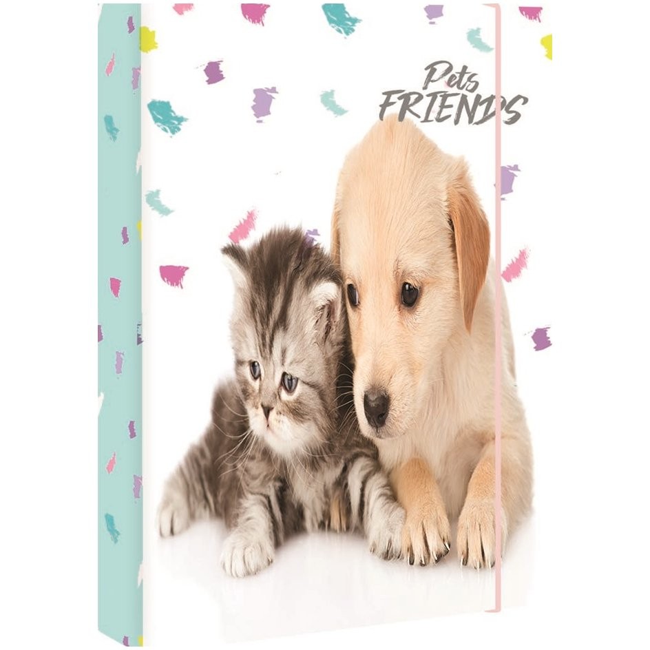 Dosky na zošity s mačiatkom a šteniatkami, ktorému neodolá žiadny milovník domácich maznáčikov. Laminované dosky s gumičkou. Šírka chrbta 3 cm.