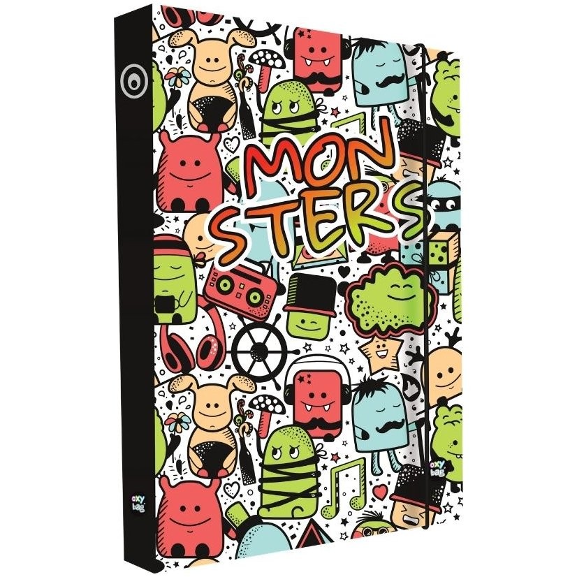 Obľúbené dosky na zošity vo formáte A4 s príšerkovým motívom. Nevyhnutná súčasť vybavenia každého školáka na uloženie zošitov, papierov a ďalších školských pomôcok. Odolný materiál - lamino, chráni proti poškodeniu. Zatváranie na gumičku. Šírka chrbta 3 cm.