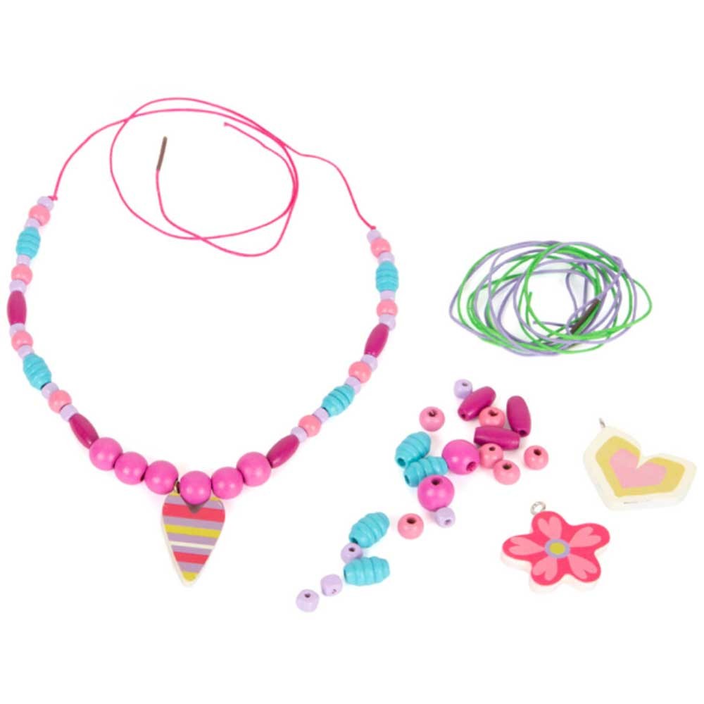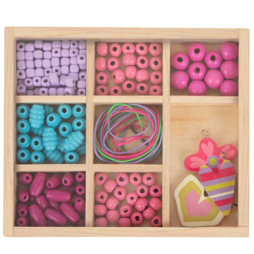 Vyrobte si svoje šperky s touto kreatívnou sadou drevených korálikov v piatich rôznych farbách a tvaroch. Korálkový set dopĺňajú tri prívesky s rôznymi motívmi v hravom dizajne a tri farebne zladené šnúry.