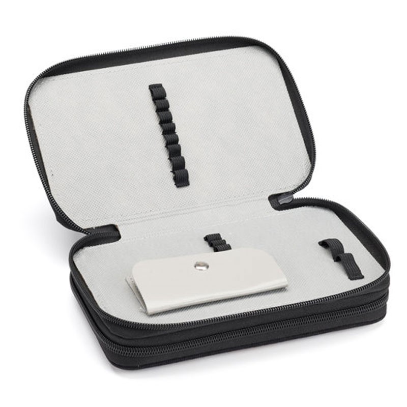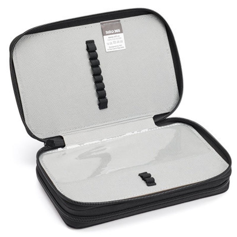 Dvojposchodový peračník á obsahuje na prvom poschodí 8 gumičiek na pastelky, 2 gumičky na ceruzky a jednu väčšiu na pero, ďalej gumičky na orezávatko a gumu a kapsičku na drobnosti, uzatvárateľnú na patent. V druhom poschodí peračníka je umiestnené priehľadné vrecko na rozvrh hodín a ďalších 9 pevných gumičiek na písacie potreby rôznych veľkostí. P>