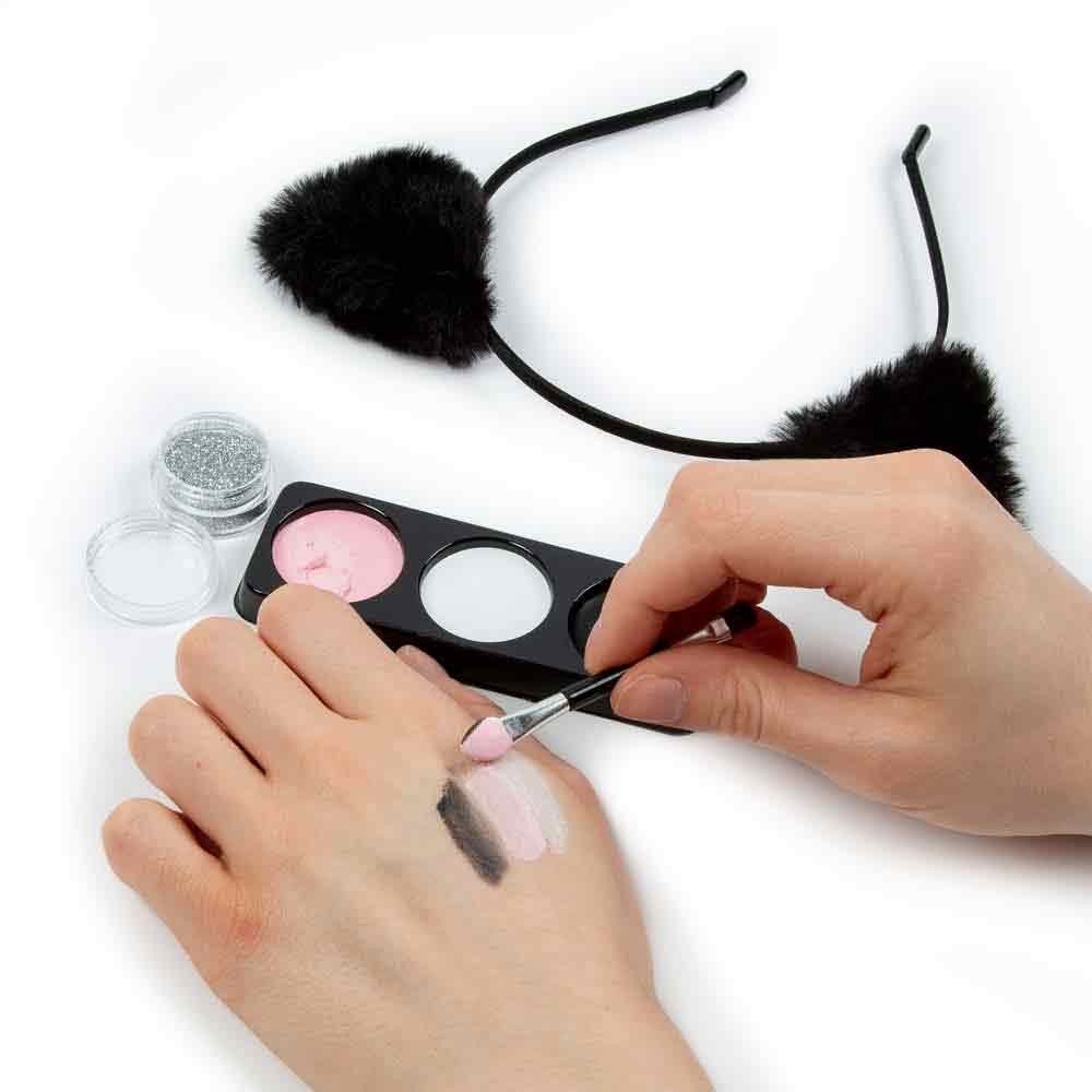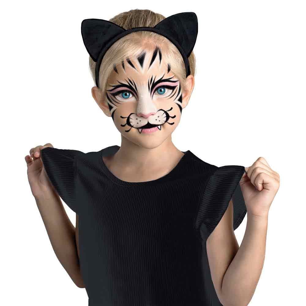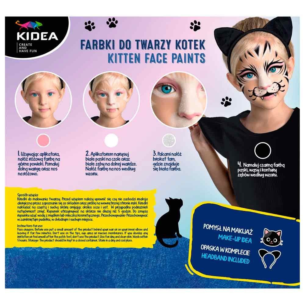 Farby na tvár pre deti sú ľahko zmývateľné, dobre kryjú, ľahko sa zmiešajú. Balenie obsahuje farby, štetec na presné nanesenie, aplikátor, trblietky, čelenku s ušami a návod na make-up.