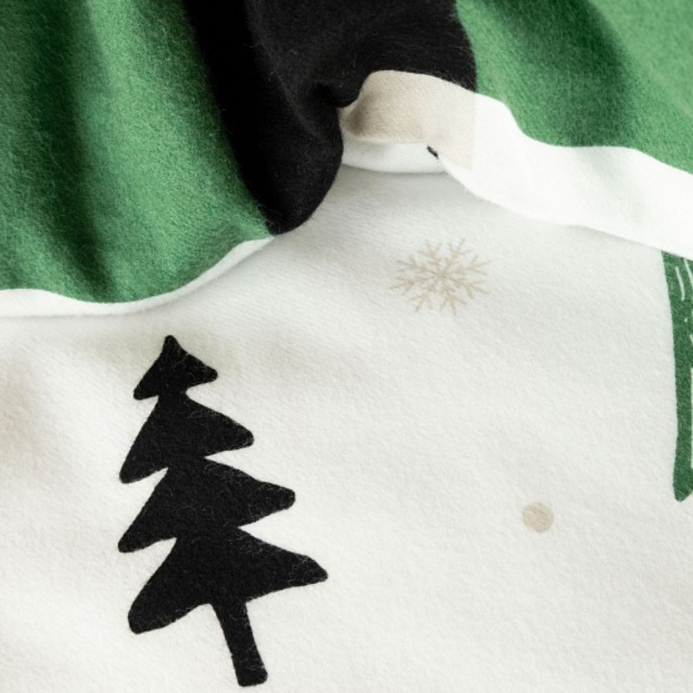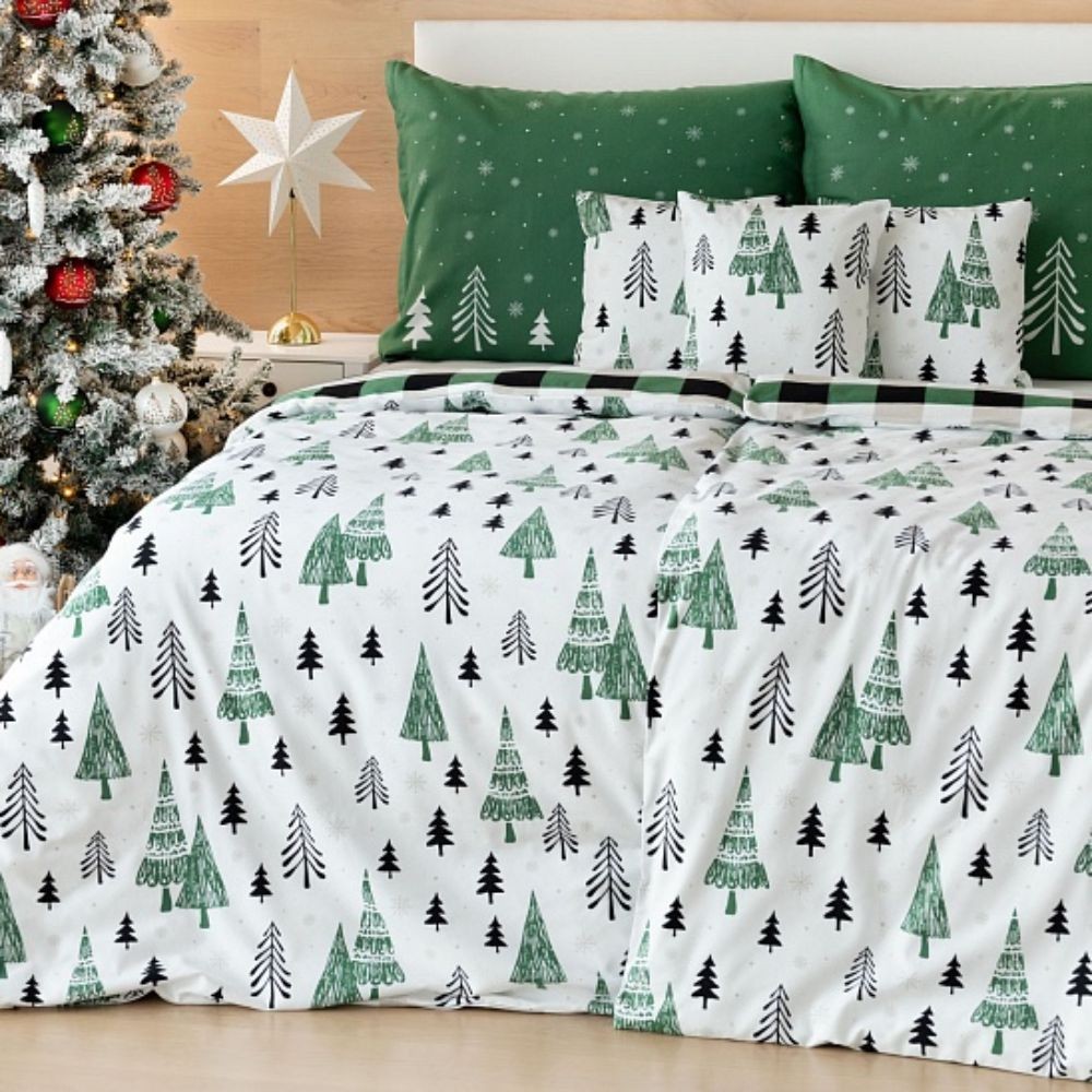Obliečka na prikrývku je na jednej strane posiata kresbami menších a väčších stromčekov, snehových vločiek a drobných bodiek. Spodnú stranu tvoria biele, čierne a zelené kocky. Obliečka na vankúš je z každej strany iná, ako je znázornené na fotografii. Obliečka na vankúš má pohodlné zapínanie na zips.