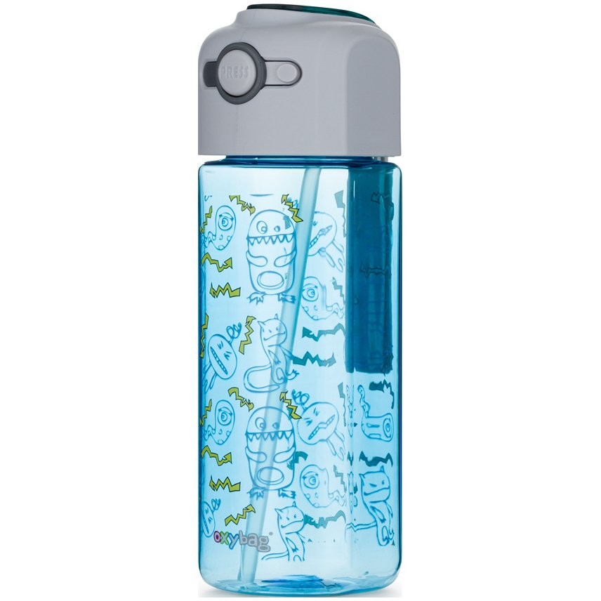 Fľaša na vodu OXY SMiLE Monsters 450 ml pre predškolské deti je špeciálne vyvinutá do detských rúk. Pitie z nej je zábavné vďaka slamke, ktorá je vo vnútri. Slamku sa dá celé vytiahnuť a vyčistiť. Fľaša je vyrobená z kvalitného, ??zdravotne nezávadného materiálu - testovaná, neobsahuje BPA ani ftaláty. Vhodná do umývačky na maximálnu teplotu 96 °C. Fľaša nie je vhodná na sýtené nápoje.