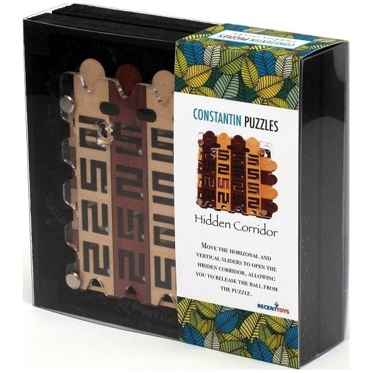 Logická hra Hidden Corriodor. Posúvajte horizontálne a vertikálne posuvníky tak, aby ste odhalili skrytú chodbu. Táto chodba vám umožní z hlavolamu vytiahnuť guľôčku. Dokážete nájsť tajnú chodbu, alebo budete navždy stratení? Originálny drevený hlavolam.