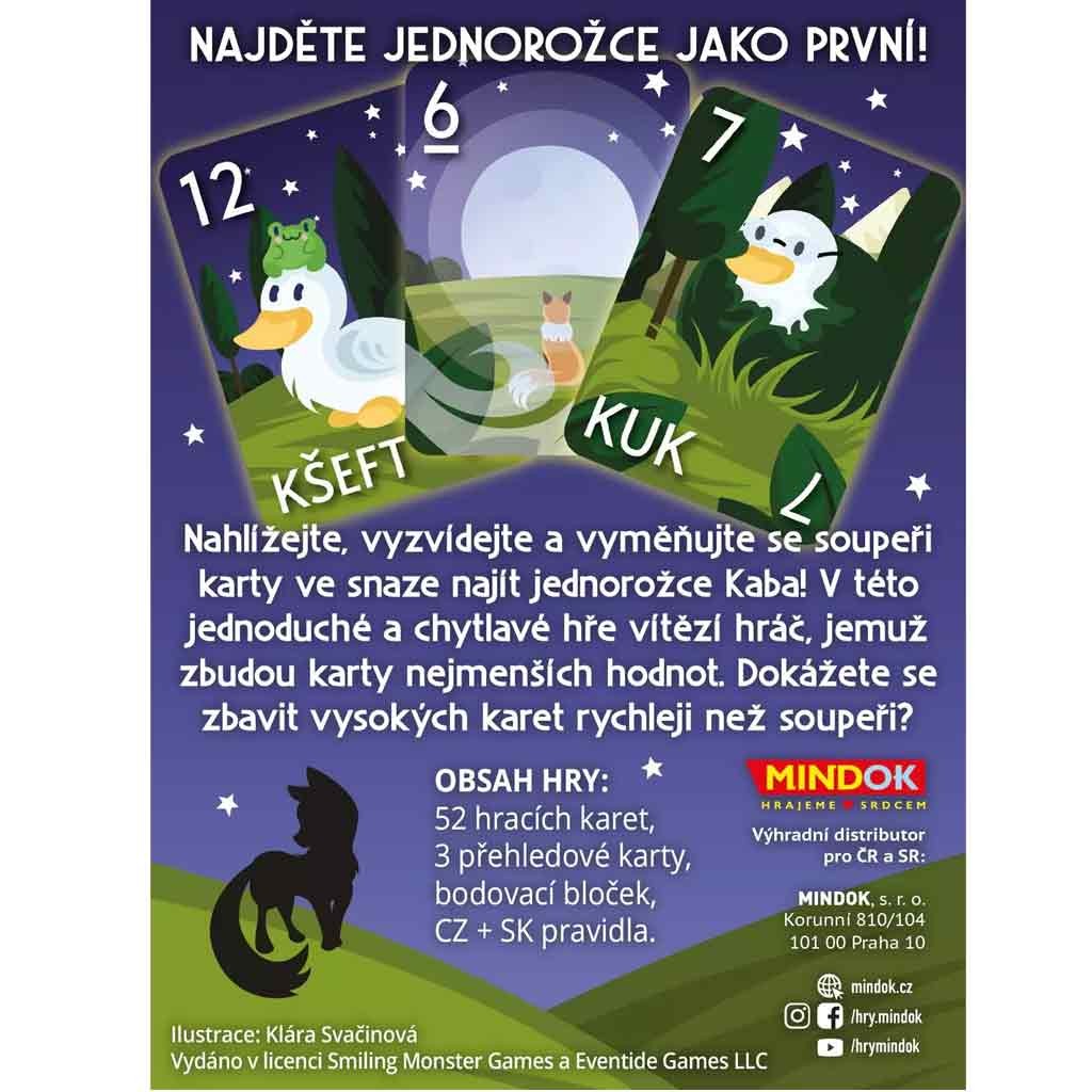 Nazerajte, vyzvedajte a vymieňajte sa súperovi karty v snahe nájsť jednorožca Kaba! V tejto jednoduchej a chytľavej hre víťazí hráč, ktorému zostanú karty najmenších hodnôt. Dokážete sa zbaviť vysokých kariet rýchlejšie ako súperi?