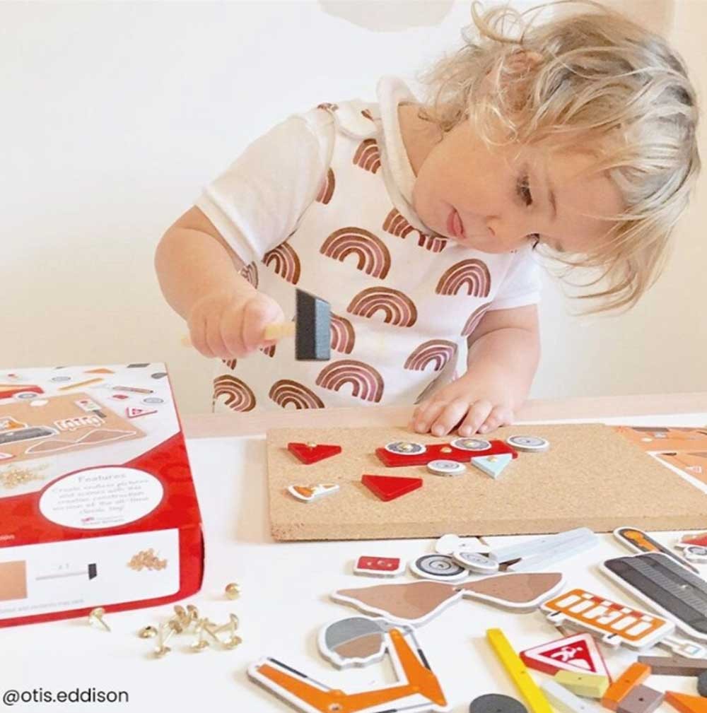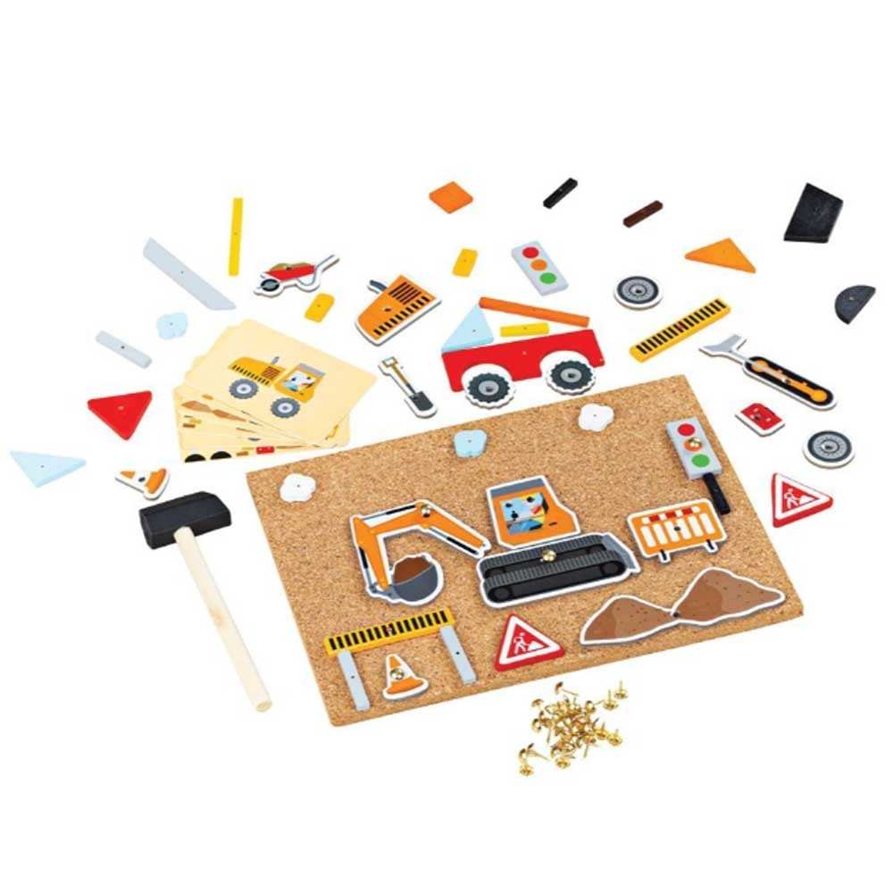 S touto zatĺkačkou pre deti si môže každé dieťa vyrobiť svoj vlastný nástenný obrázok s motívom autodopravy. Drevené a kartónové dieliky skladačky majú predvŕtané otvory, malé klinčeky možno ľahko zatĺcť do korkovej dosky dreveným kladivkom.