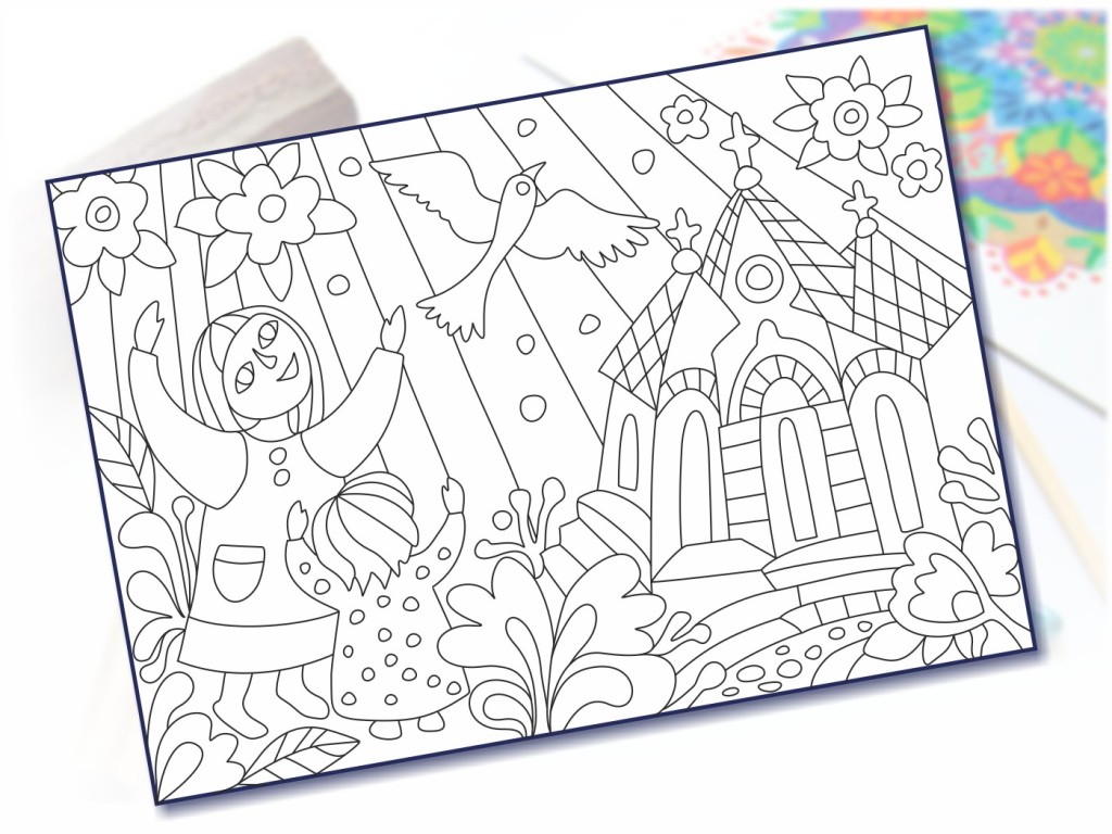 Maľovanie pieskom šablóna A4 kostol s holubicou