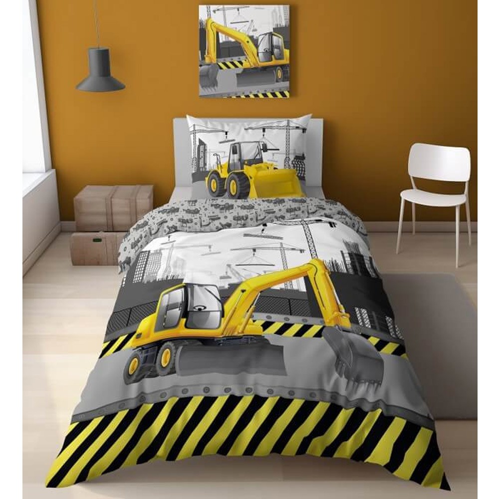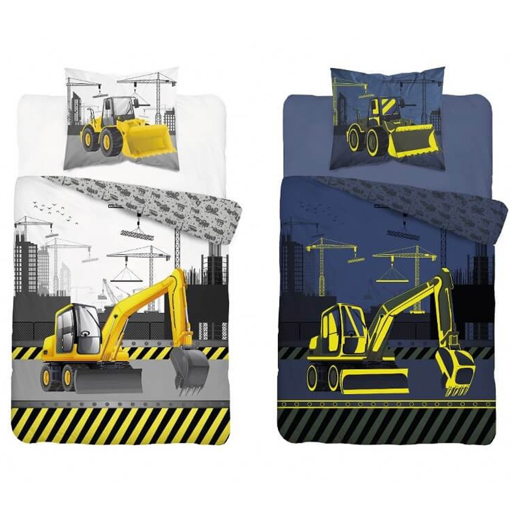 Chlapčenské obliečky Bager pre každého, kto má tieto stroje v obľube. Bavlnené obliečky svietia v tme po nasvietení na dennom svetle.