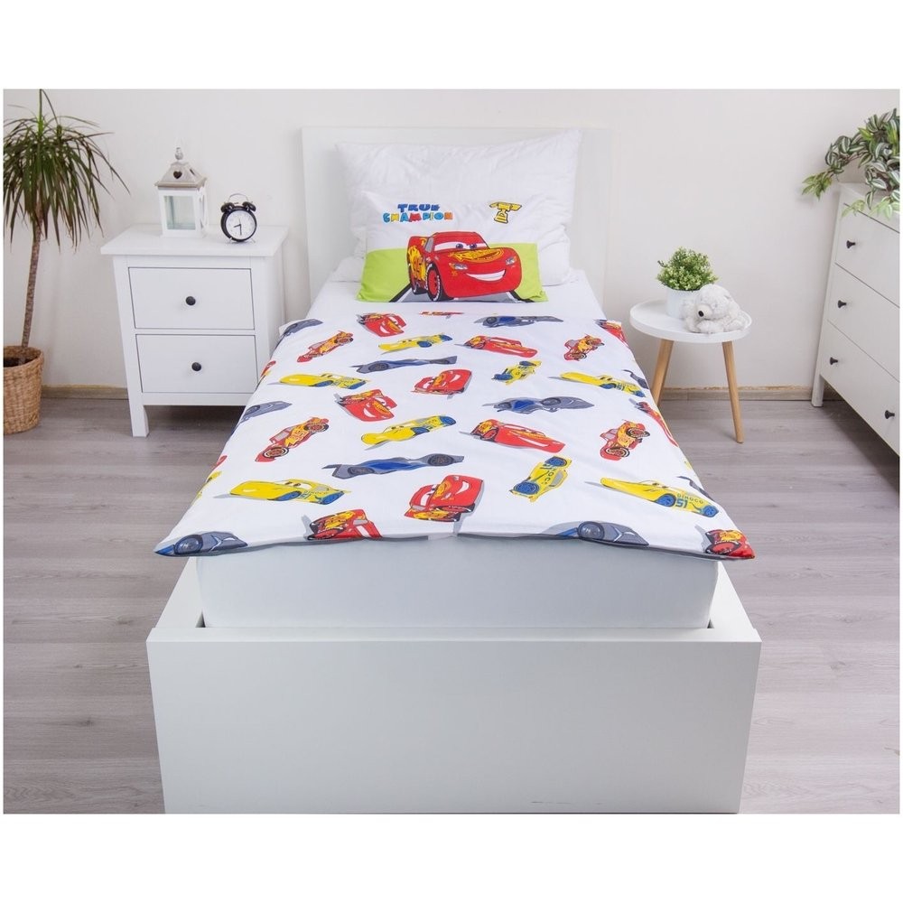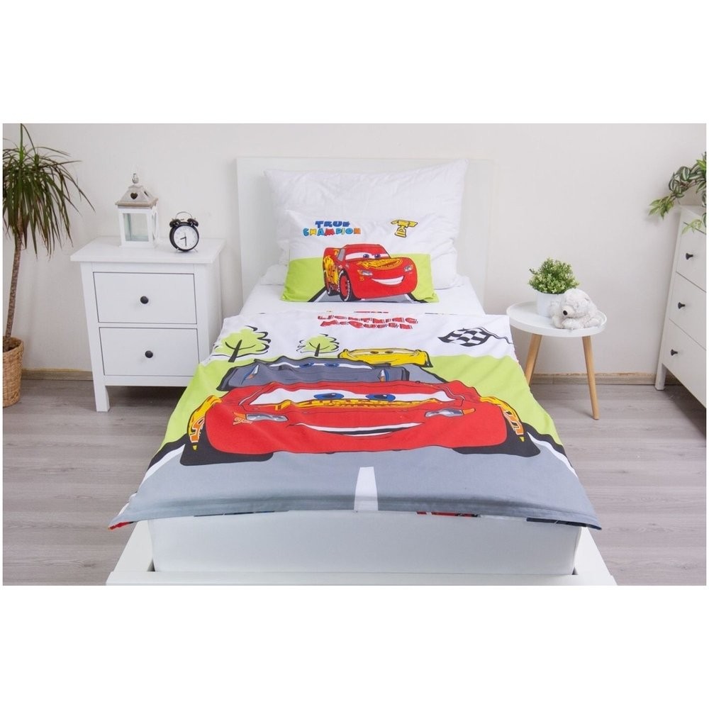 Obliečky do postieľky Cars Champion s Bleskom McQueenom, nápisom „TRUE CHAMPION“ a závodnou scénou. Ideálne pre malých fanúšikov filmu Cars – pohodlie a rýchlosť v jednom! Rozmer obliečky je 40x60, 100x135 cm.
