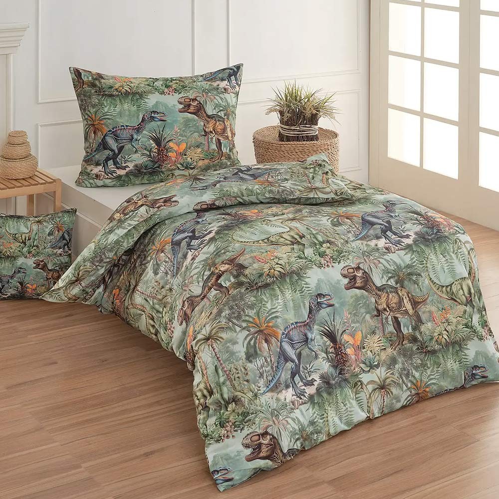Bavlnené detské obliečky Dino poteší všetkých malých i väčších milovníkov jurského obdobia. Povlečenie Matějovský má prepracované farebné ilustrácie obľúbených prehistorických tvorov, ktoré premenia každú posteľ na dobrodružnú džungľu, kde čakajú obrí dinosaury, tyranosaury a brontosaury. Prvotriedna bavlna zaistí pokojný spánok detí a vďaka najmodernejšej digitálnej technológii tlače si farby zachovajú svoju sýtosť aj po mnohých praniach.
