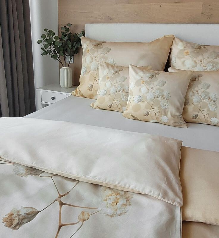Luxusné saténové obliečky Julia úplne zvádzajú k zababušeniu. Nežný florálny motív v hrejivých krémových a béžových tónoch sa bude vynímať v každom interiéri. O váš zaslúžený spánok sa postará 100% bavlnený satén vyrobený z priadze prvotriednej kvality.