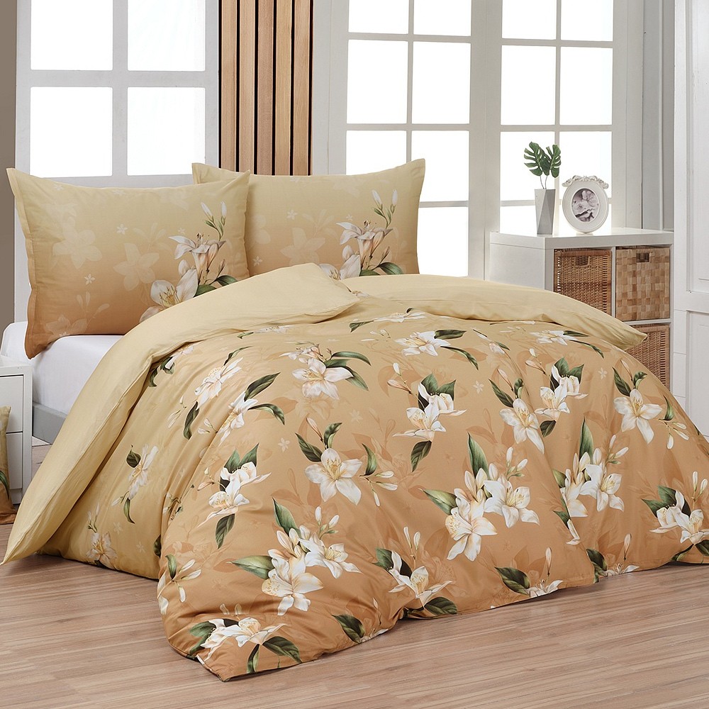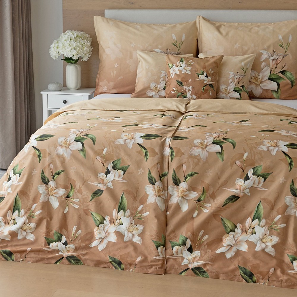 Saténové obliečky Nova s očarujúcim motívom bielych ľalií sa stane elegantnou ozdobou každého interiéru. Hrejivý orieškovo hnedý podklad prechádza postupne do béžového odtieňa a dáva vyniknúť precíznym detailom digitálnej potlače. Materiál: 100% bavlna
