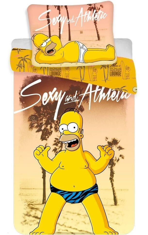 Bavlnené obliečky na veľkú posteľ s drsňákom Homérom Simpsnom na pláži. Obliečky sú obojstranné, zapínajú sa na zips a majú rozmery: 140x200 cm, vankúš 70x90 cm.