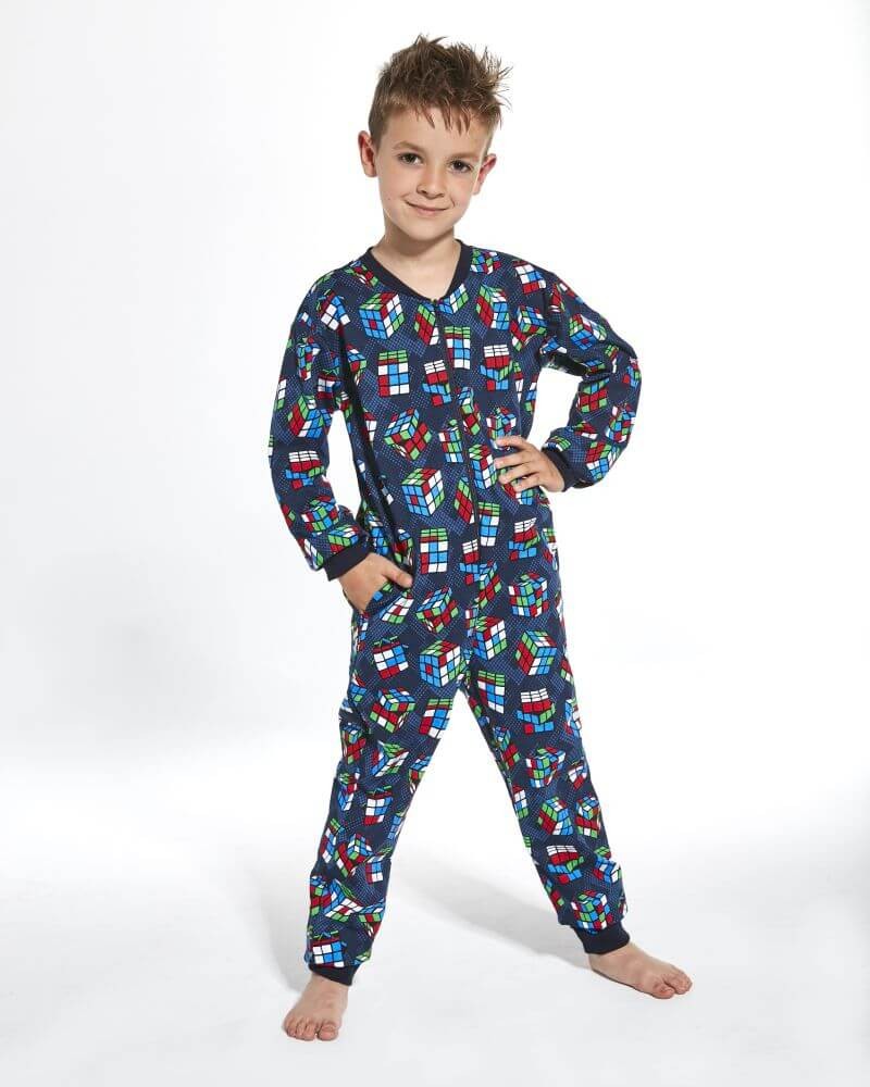 Chlapčenský overal na spanie značky Cornette s dlhým rukávom a dlhými nohavicami so zúženými koncami pre pohodlné nosenie. Overal zdobí pekná potlač kociek na modrom podklade. Overal sa zapína na zips.Materiálové zloženie: 100% bavlna.Veľkosť 110/116 122/128Obvod pása 52-56 54-58 cmObvod hrudníka 58-62 62-66 cm