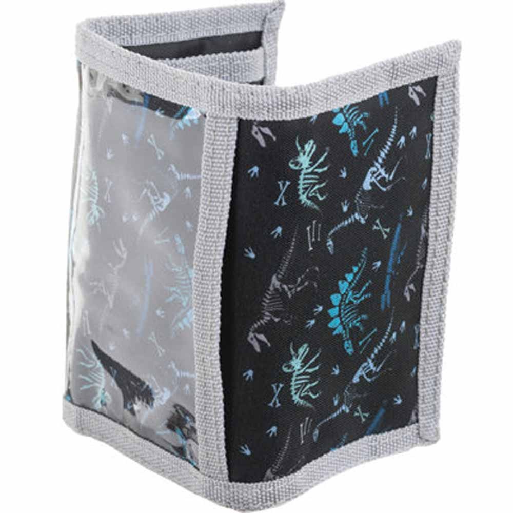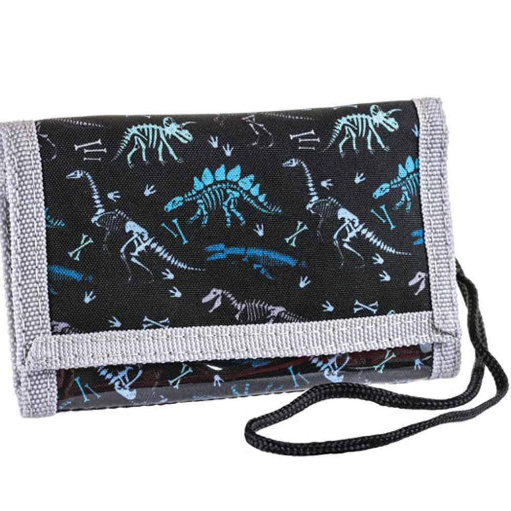 Peňaženka na krk so šnúrkou a suchým zipsom s motívom dinosaura. Má 5 vreciek (z toho jedno zipsové na mince a jedno na bankovky), priehľadnú kapsičku na preukaz a karabínku na kľúče alebo čip.