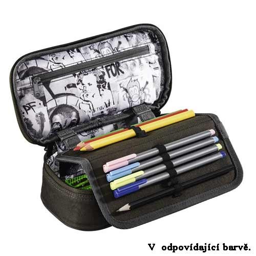 Nevybavený peračník na perá, ceruzky, pastelky, pravítka, uhlomer, gumu a ďalšie školské potreby.